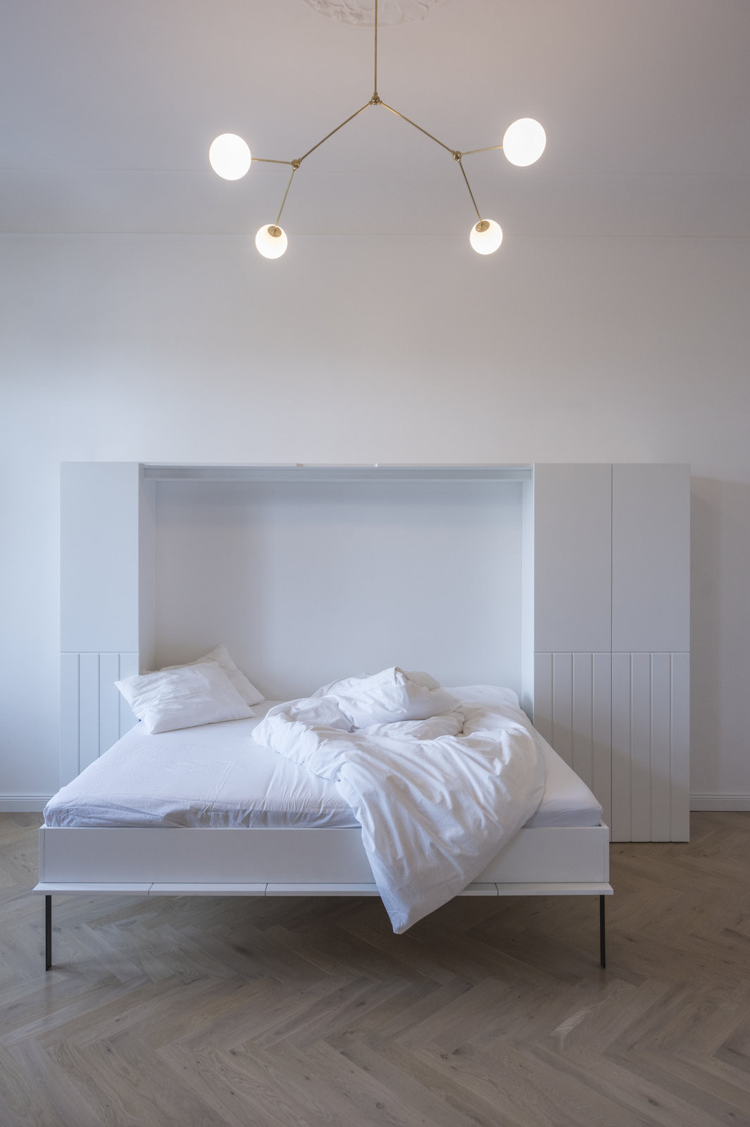 Truhlářské řešení zde nefunguje pouze jako vybavení, ale jako integrální součást architektury bytu – prvek, který prostor člení, sjednocuje a technicky i vizuálně ukotvuje celé řešení v kontextu historické stavby