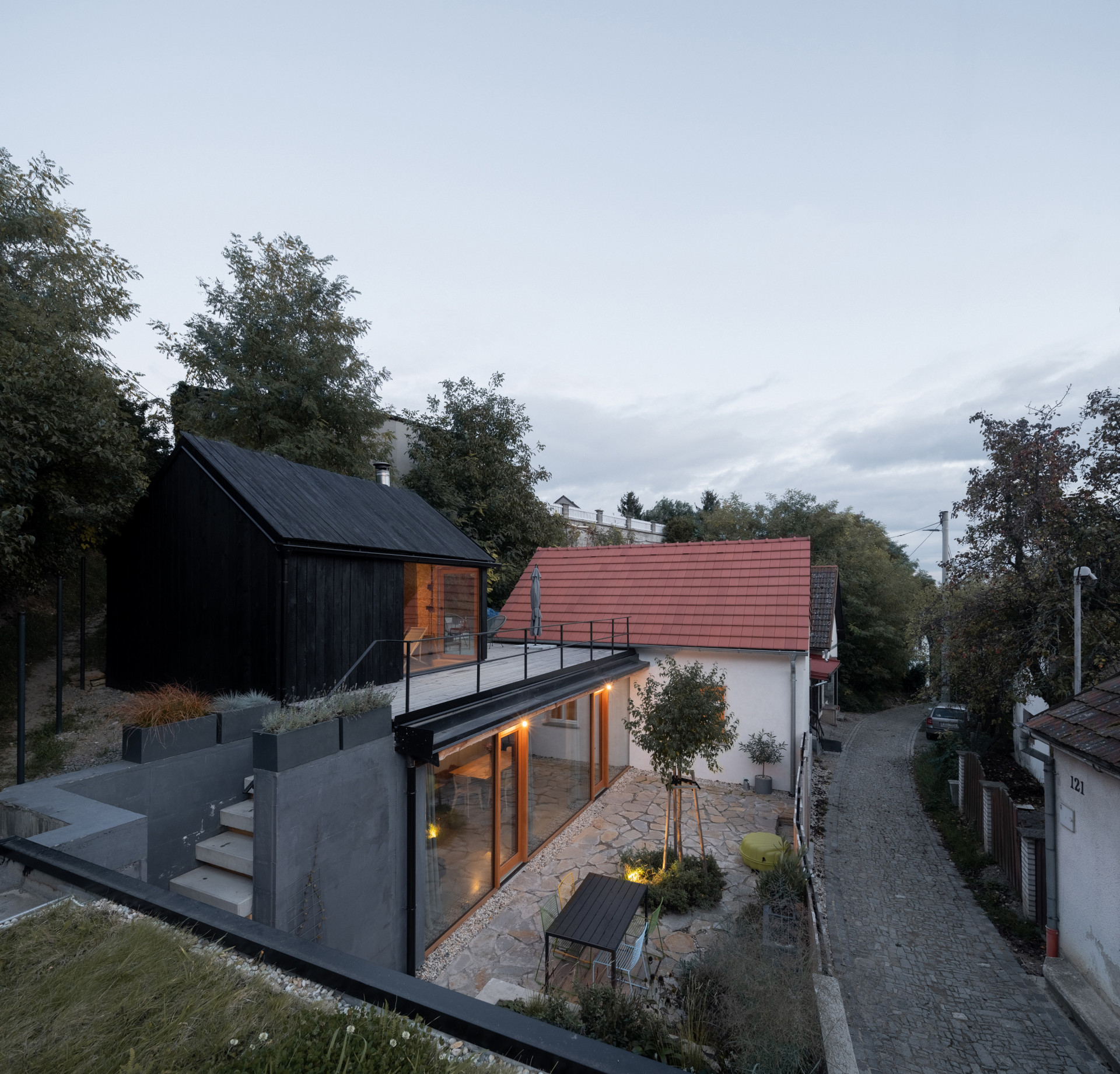 Dům využívá do posledního kousku prudce se svažující pozemek. Na ploše 230 m2 se kromě domu samotného nachází i kůlna na kola a nad střešní terasou je do svahu zakousnutý bazén s panoramatickým výhledem do okolí.