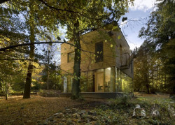 Přízemí je koncipováno jako jeden prostor se středovým jádrem, do kterého je integrována kuchyňská linka, technická místnost, odkládací prostory, schodiště a krb. Posuvnými stěnami lze obytný prostor s kuchyní oddělit od jižní chodbové části, která je využívána jako zimní zahrada. Jádro umožnilo otevřít obvod panoramatickému výhledu do přírody, která dům těsně obklopuje. Obytný prostor tedy plynule přechází od křesla u krbu až pod koruny stromů stojících v zahradě. Horní patro je tichou a uzavřenou úrovní domu. Je zde navržena pracovna s velkým oknem směrem do ulice, ložnice dítěte, ložnice rodičů a velká koupelna. Ložnice mají úzká okna s průhledy do zahrady. Velké okno nad vanou v koupelně vymezuje pohled do korun stromů.