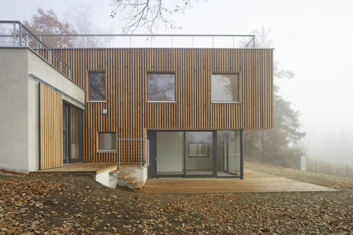 „Tajné“ schodiště vede po fasádě z ložnice na střešní obytnou terasu, která poskytuje místo pro pobyt a odpočinek. Přirozené stínění větvemi vzrostlého dubu a vysoká atika po celém obvodu střechy vytvářejí skryté intimní místo pod otevřenou oblohou. Zvolili jsme skeletovou dřevěnou konstrukci, která umožnila minimalizaci tloušťky obvodových stěn i zkrácení doby výstavby. Práh na základové desce, sloupky (1. NP z lepeného dřeva), stěnový vazný trám, stropnice, ve střední části průvlak a ocelové táhlo. Prvky jsou vzájemně tesařsky propojeny. Vnitřní stěny jsou konstrukčně zavětrovány šikmými vzpěrami, obvodové stěny jsou v horním patře ztuženy OSB deskami, které jsou součástí skladby stěny a plní zároveň funkci parotěsné zábrany. Stropní trámy ve 2. NP jsou sbíjené. Fasádu v přízemí tvoří celoplošné pevné zasklení izolačním sklem kotveným do nosných sloupků konstrukce, malá větrací výklopná okna a francouzská okna. Plášť provětrávané fasády v horním patře domu je z nehoblovaných prken ošetřených ochranným nátěrem.