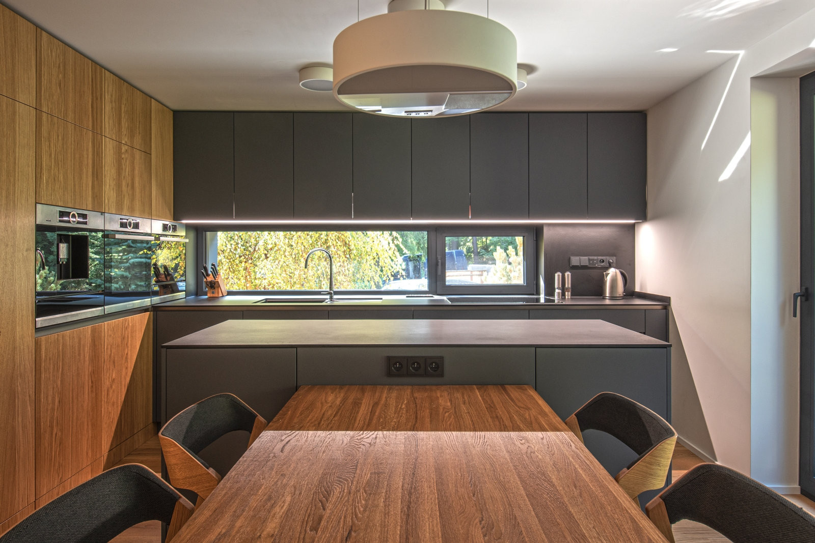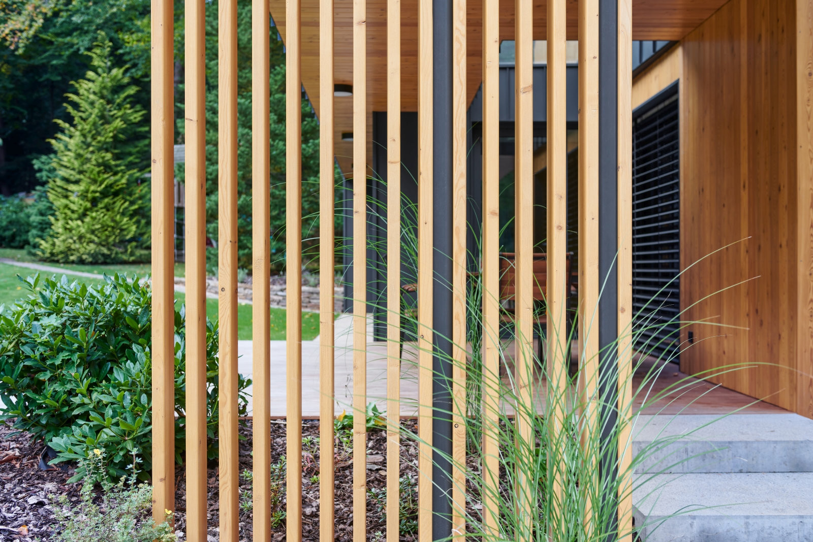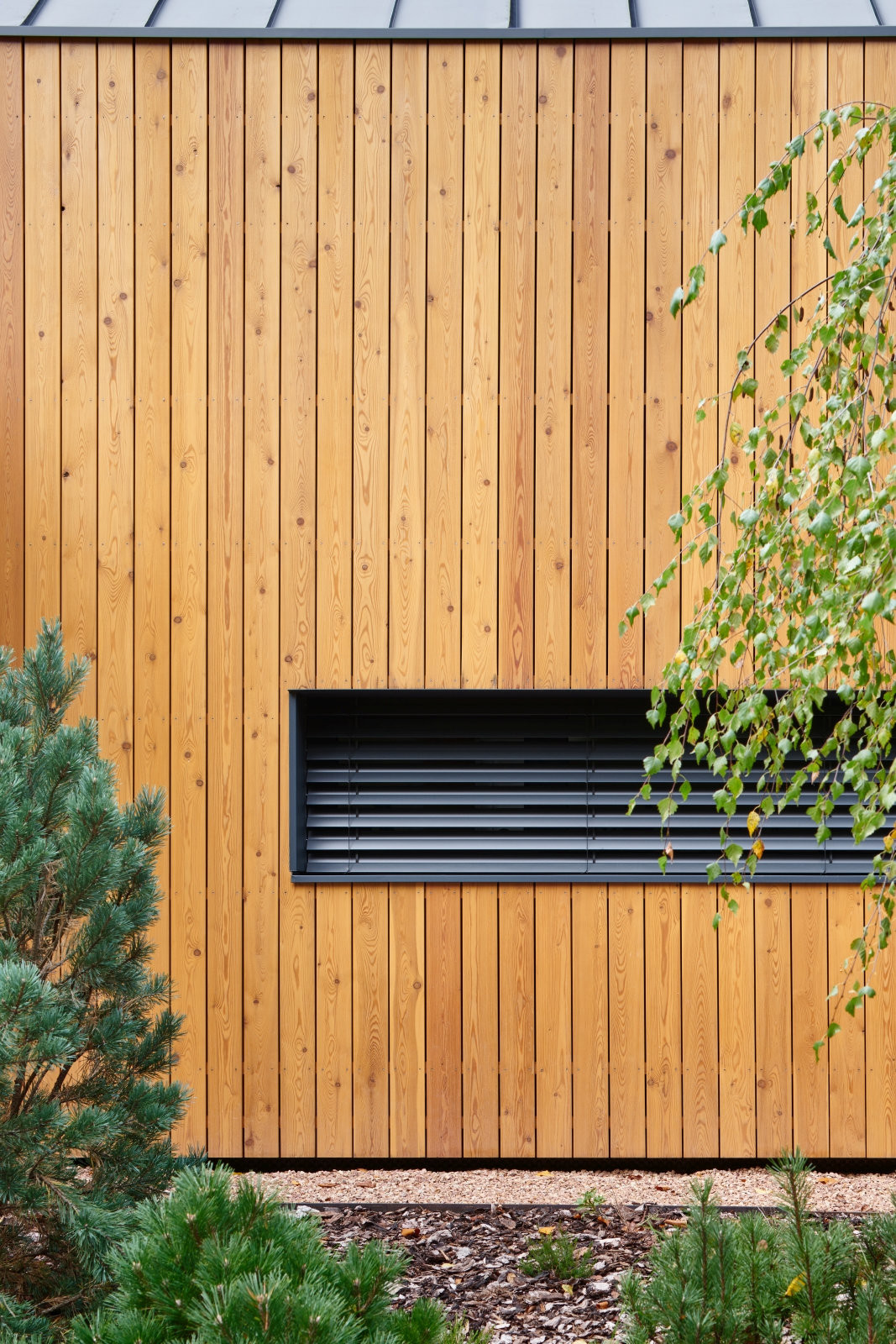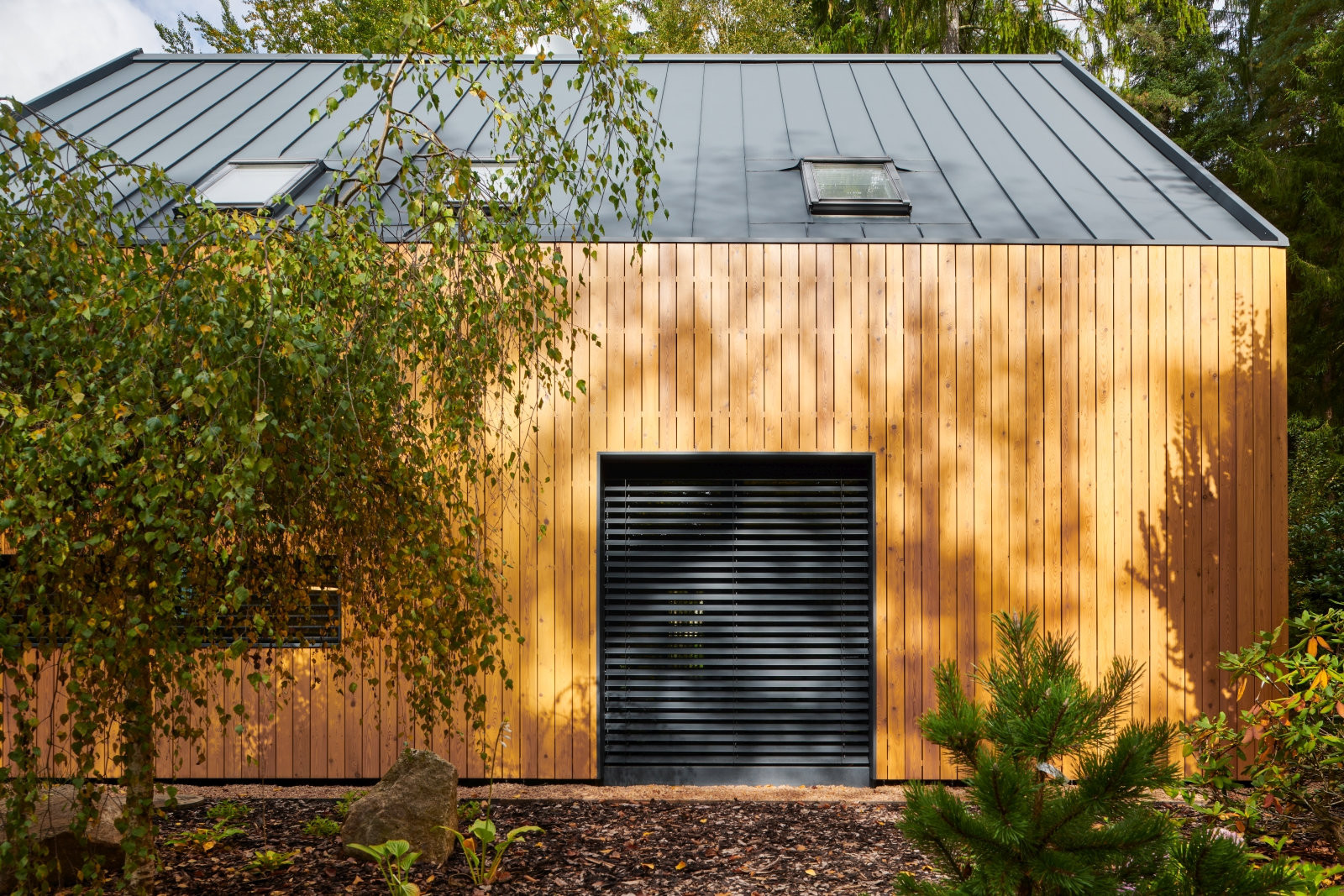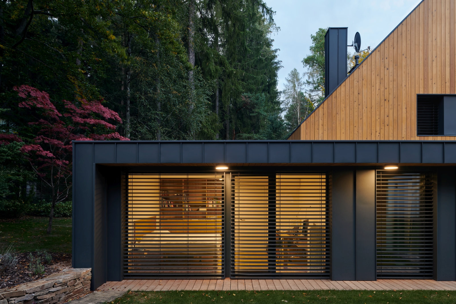 Jako materiál fasády byla zvolená dřevěná prkna (sibiřský modřín), v kombinaci s plechovým obkladem na hmotě přístavby. Hliníková okna, tmavě šedé barvy, podtrhují zcela moderní charakter domu.