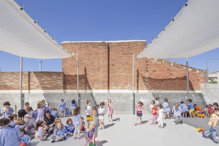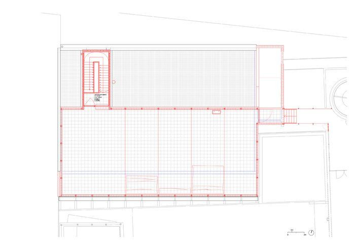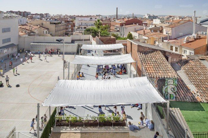 Zásah na severní fasádu - předem izolovanou - je minimální, ale zásadní. Zachováváme stávající zednické práce i stávající složení fasády. Společně s vnitřními stropními klenbami je to také poslední stopa původní budovy. Bílé dřevo zůstává nedotčeno. A šest nových oken zlepšuje příčné větrání s jihem. Nové venkovní prostory Polovina jižní střechy, která dříve nebyla přístupná, je přeměněna na nové venkovní hřiště s krásným výhledem na města. Další nové nádvoří, pro malé děti, se objeví pod schodištěm sportovního centra. Betonová střecha u výtahu -40m2- se stává také hřištěm s pisčitou plochou a tribunou pro děti.