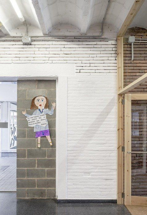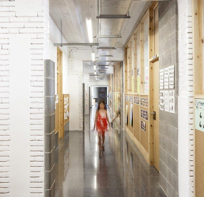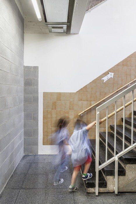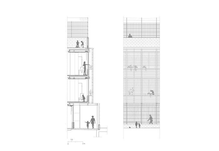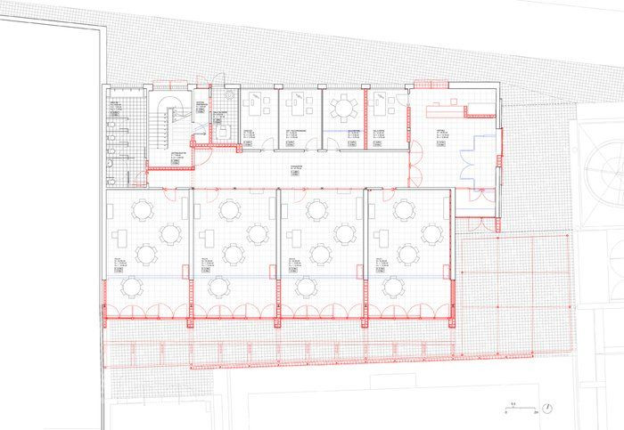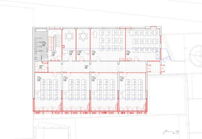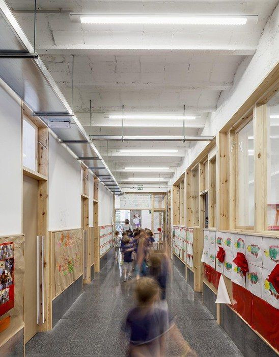 Nejdražší zásah projektu je rozšíření budovy, které jsme ospravedlnili nedostatkem plochy stávajících učeben umístěných na straně budovy, která je u ulice. Paradoxně se rozšíření ukazuje na vnitřní fasádě - samozřejmě není možné roztáhnout budovu do ulice – a sahá od 15,5 m až 18,5 m hloubky. V přízemí zachováváme stávající chodbu na svém původním místě, zatímco předškolní učebny se rozšiřují na stranu do dvora a zvětšují se z 35 na 50 m2. Na druhou stranu, pro první a druhé patro je chodba přesunuta na opačnou stranu centrální ložné stěny tak, aby všechny učebny směřující k ulici mohly být rozšířeny. Tato změna dává místo jedné z nejsilnějších koncepcí návrhu: otevření nového koridoru, který překračuje 30 cm.
