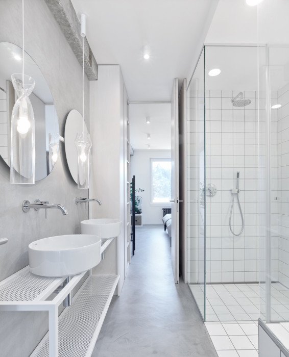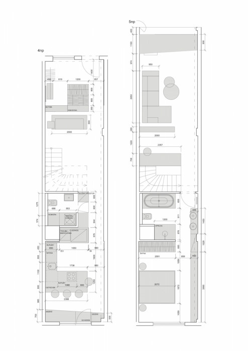„Potěšilo nás, že se klienti betonových povrchů nebáli a od začátku jsme v tomto byli naladěni na stejnou vlnu. Občas slýcháme, že jsou naše interiéry studené a díky surovějším povrchům vypadají jako nedodělané, ale to, že se naše práce nelíbí každému, je v pořádku. Každý vnímáme barvy a jejich odstíny jinak. My třeba vidíme barevnost a živelnost skrytou v deseti odstínech černé nebo šedé barvy, neméně důležité jsou pak i různé struktury a materiály,” vysvětluje architektka Klára Valová, zakladatelka studia SMLXL. Byt v nenápadném pavlačovém domě z počátku 90. let potřeboval upravit dispozici a vyřešit interiér tak, aby z komplikovaného půdorysu – dvě 3 metry široká a 15 metrů dlouhá patra o celkové rozloze 98 m² – vytěžili jeho majitelé maximum.
