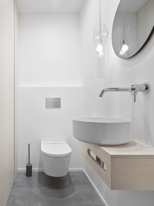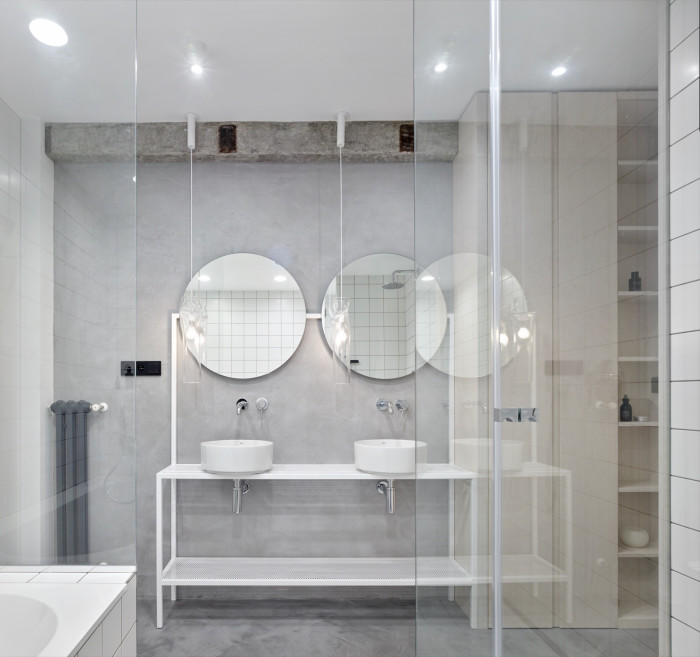 Industriálně laděný interiér zjemňují elegantní materiály jako je kouřové sklo, jímž je opláštěná digestoř, kůže použitá na čele postele nebo černě mořená dýha na nábytku. Koupelnu rozzářily světla české značky Lasvit, interiér doplnily barové židle dánské designové značky Hay. Všechen ostatní nábytek je vytvořen na míru. SMLXL totiž zastává jasný názor, že byt není showroom. Klientovi se musí přizpůsobit na míru přesně dle jeho konkrétních potřeb.