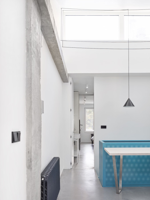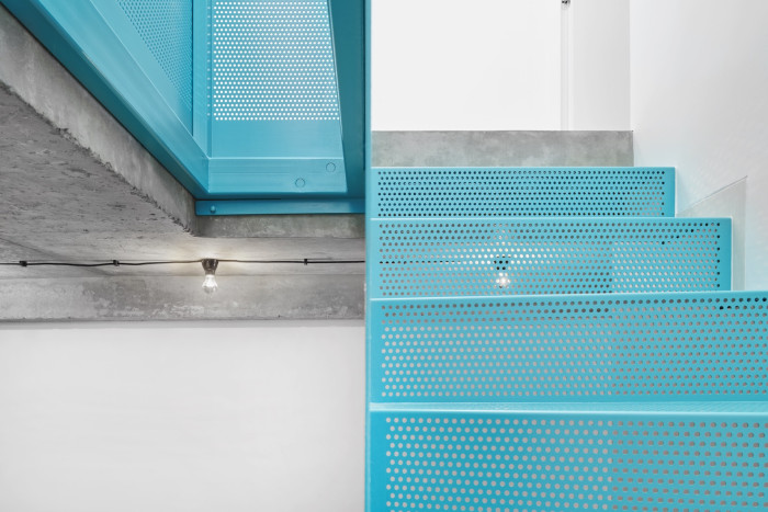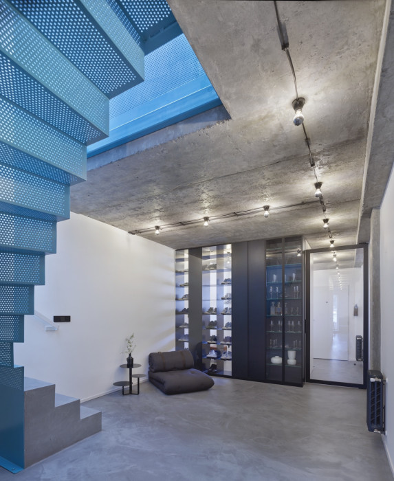 Srdcem celého bytu se stalo ocelové zavěšené schodiště potažené výrazným modrým lakem. Barevný prvek pomyslného středu bytu na sebe poutá pozornost a skvěle vyniká v neutrálním prostředí celého interiéru. Schodiště nyní propojuje spodní patro bytu, kde se nachází vstupní hala, kuchyň a toaleta, s horním privátnějším patrem, do kterého architektky umístily ložnici, koupelnu a obývací pokoj s pracovnou.