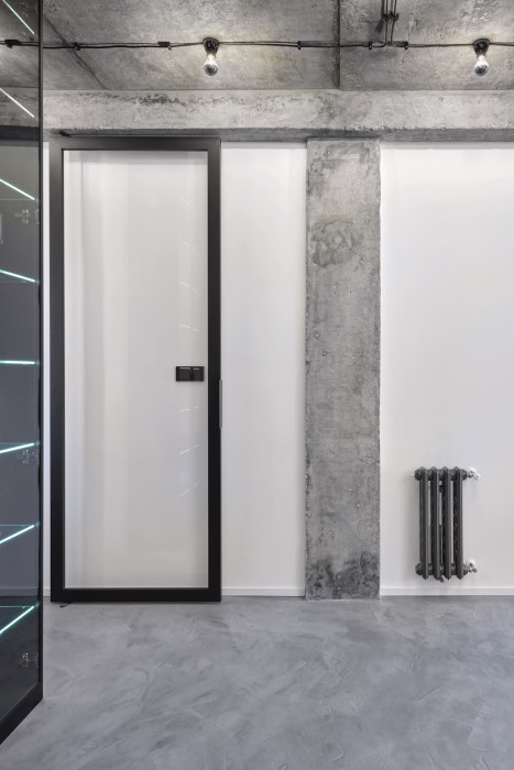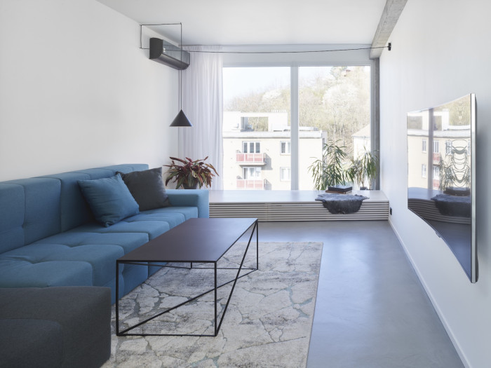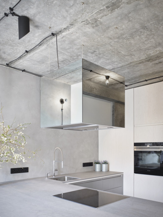 Nápad očistit původní konstrukce a nechat vyniknout jejich surový hrubý povrch nejvíc ovlivnil výslednou podobu bytu a jeho industriální atmosféru. Architektky Klára Valová a Eva Mohylová odhalily železobetonový skelet s panely a betonový strop a sloupy ještě doplnily betonovou stěrkou na podlaze. Vznikl tak monochromatický základ, který slouží jako malířské plátno pro další výrazné prvky.