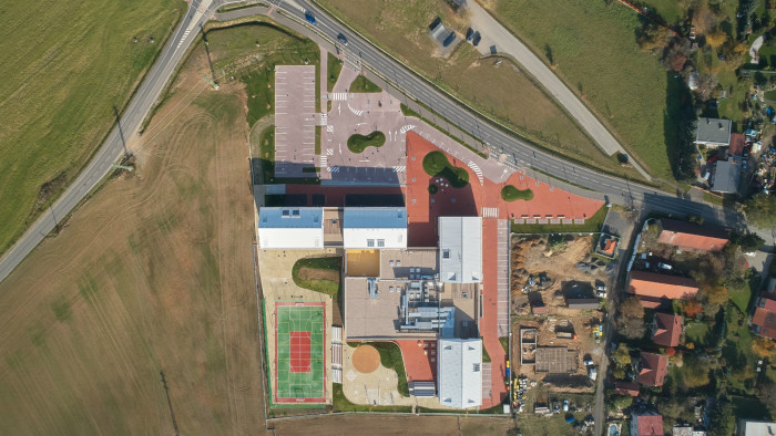 Hlavním cílem urbanistického konceptu areálu nové školy bylo vytvořit v kontextu obce místo s vlastní identitou, které nebude navzdory své velikosti ve významovém ani prostorovém konfliktu se stávající zástavbou a jejími přirozenými centry. Budova školy má vytvořit ukončení urbanistické osy vedoucí k návsi na Hlavní a Pražské ulici, která projde v blízké budoucnosti rozsáhlou revitalizací, a dát jí potenciál živé obecní komunikace s přirozeně fungujícím parterem. Jako protiváha prostoru návsi funguje v areálu školy veřejný prostor v jihovýchodním rohu pozemku zakončený výrazným oknem školní knihovny, který přes parterové prvky rekreační zeleně přechází do vstupního prostranství školy.