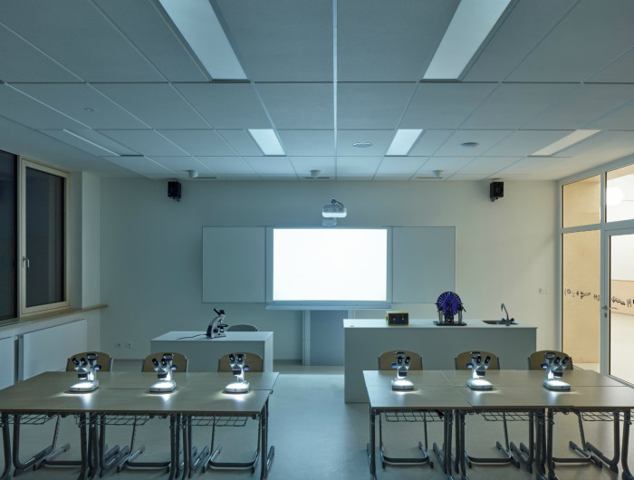 Dispoziční uspořádání ve výukových částech objektů B a C je založeno na principu dílčích jednotek, tzv. klastrů pro cca 80 žáků, které tvoří přehledné celky vždy dvou až tří kmenovým učeben seskupených kolem společné centrální haly. Díky vizuálnímu propojení učeben s halou tak vzniká jasně ohraničený variabilní prostor pro výuku v mnoha formách s množstvím zákoutí, se kterým se mohou jeho uživatelé v rámci velké školy snadněji identifikovat a přizpůsobit si ho i díky rozsáhlé aplikaci popisovatelných a magnetických stěn.