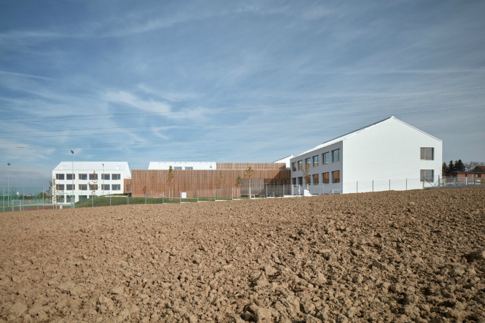 Škola je zasazena do mírného svahu, který umožnil pracovat s podlažností rozdílnou vůči veřejnému prostoru a směrem do areálu. Budova je rozčleněná podle funkčního využití na dílčí stavební hmoty, které se měřítkem co nejvíce přibližují stavbám v okolí. Tvář školy vůči obci určují výškově dominantní dvoupodlažní objekty, které obsahují vlastní výukové prostory. K jejich ztvárnění je použita typologie venkovských hospodářských stavení v abstrahované podobě podpořené minimalistickým materiálovým řešením a elementárním členěním fasád. Centrální objekt, který obsahuje společné funkce obou stupňů základní školy a celou budovu provozně i opticky propojuje, je naopak navržen jako čistě technická stavba o jednom nadzemním a jednom podzemním podlaží. Navenek se prezentuje výrazně profilovanou, ale celkově kompaktní fasádou z dřevěných lamel pracující s různými stupni průhlednosti podle potřeb vnitřních prostorů.