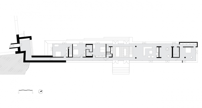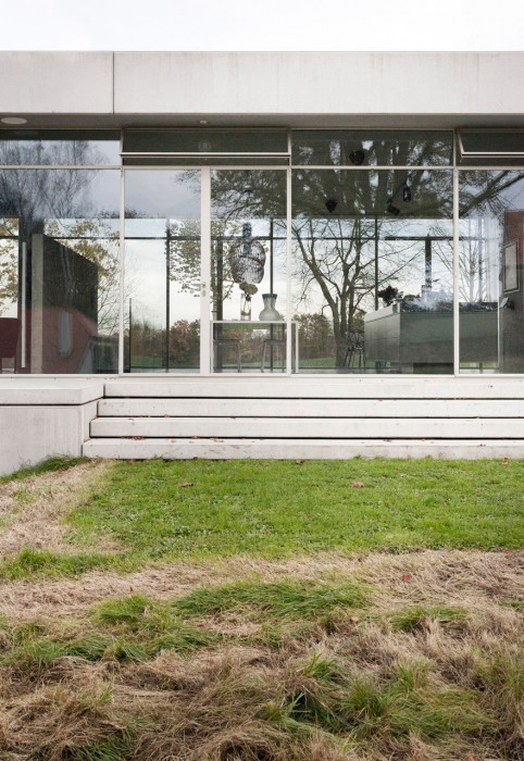 Samotná novostavba je navržena v modulu 1200 mm a je tvořena téměř celoproskleným hlavním obytným podlažím, které sedí na suterénním soklu s technickým a provozním zázemím objektu. Zatímco ten má obklad z místního kamene, konstrukční souvrství podlahy a střechy přesahují po celém obvodu do prostoru o 600 mm a jsou krytá prefabrikovanými betonovými dílci.