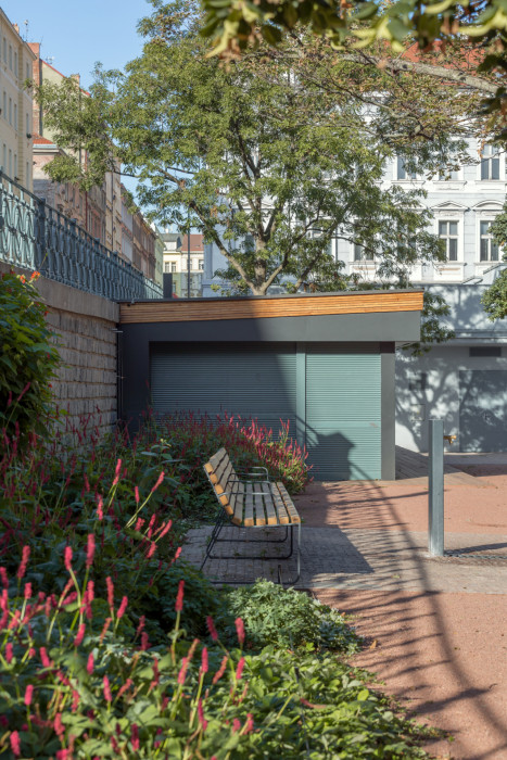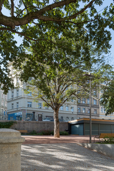 Cenným těžištěm v kontextu okolí je volný prostor pod korunami stromů, orámovaný rostlinami, díky nimž může návštěvník vnímat proměnlivost přírody, barvu a vůni květů.Součástí návrhu byl i vodní prvek skrytý v dlažbě – mlžící systém, přispívající k lepšímu mikroklimatu v letních dnech. Pro větší bezpečnost prostoru v nočních hodinách bylo dbáno na přehlednost prostotu, jeho nasvícení a to zejména temných částí pod kamennou zdí.