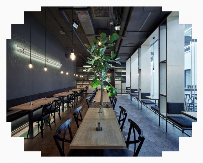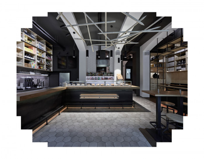 Ze vstupních prostor, které jsou lahůdkářstvím, jídelnou a skladem, se několika kroky podél baru přesouváte přes kavárnu, bar a kuchyň do klidné zahrady, kde si pod stromy můžete vychutnat atmosféru zahradní slavnosti. Jednoduchost a skromnost celého interiéru nechává vyniknout malým detailům, jako je hra s dlažbou v podlaze, ruční výmalba válečkem nebo skryté nabíjecí stanice pro telefony.