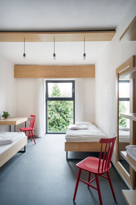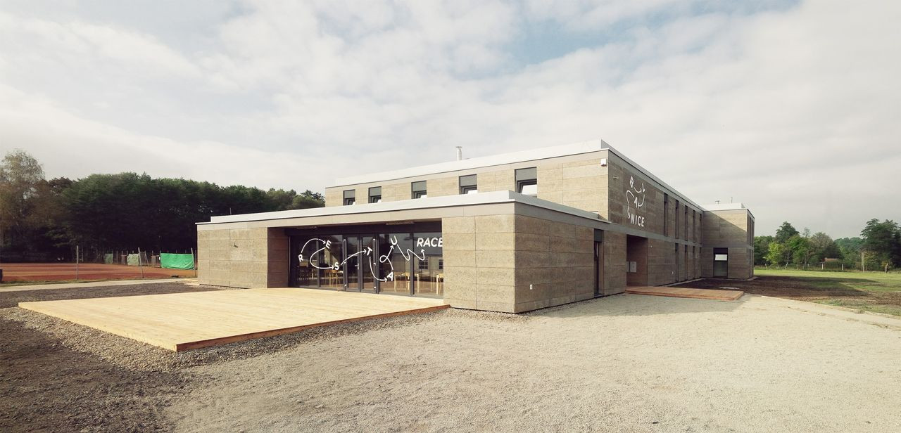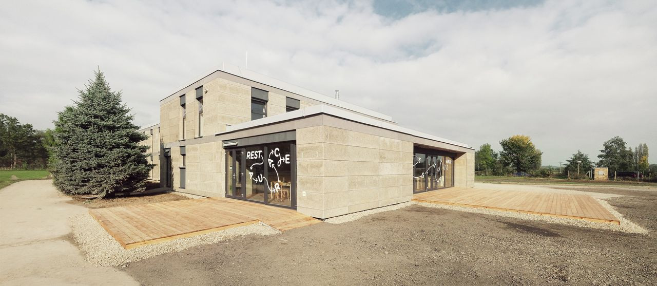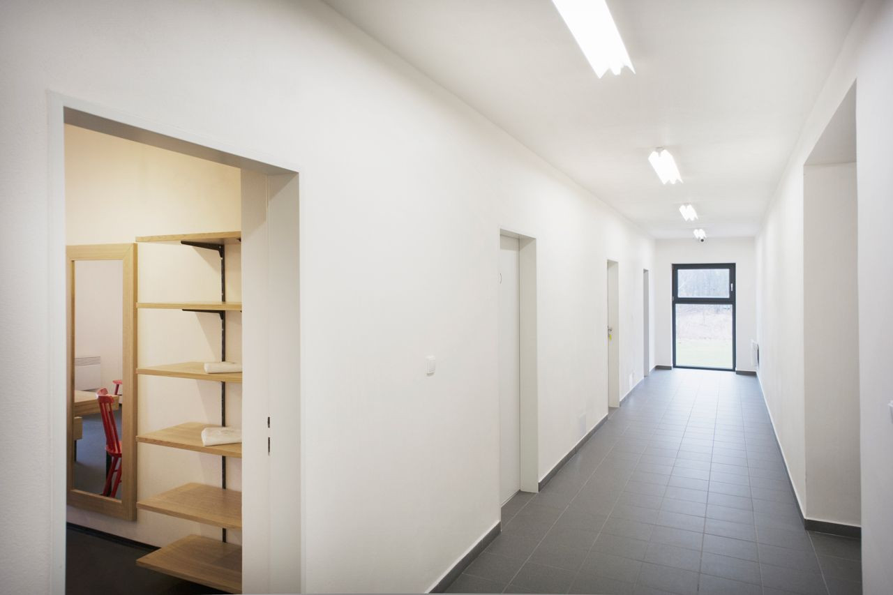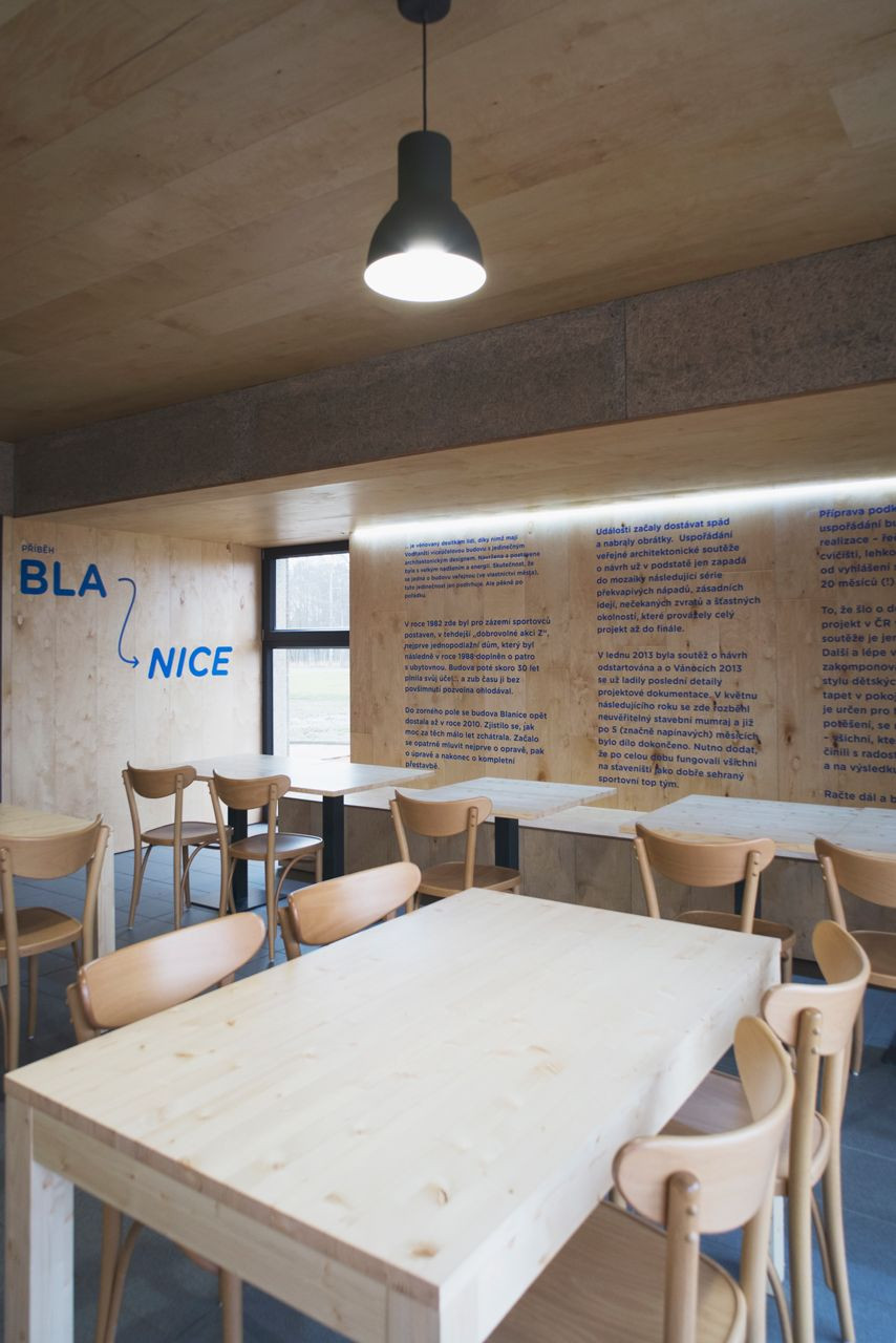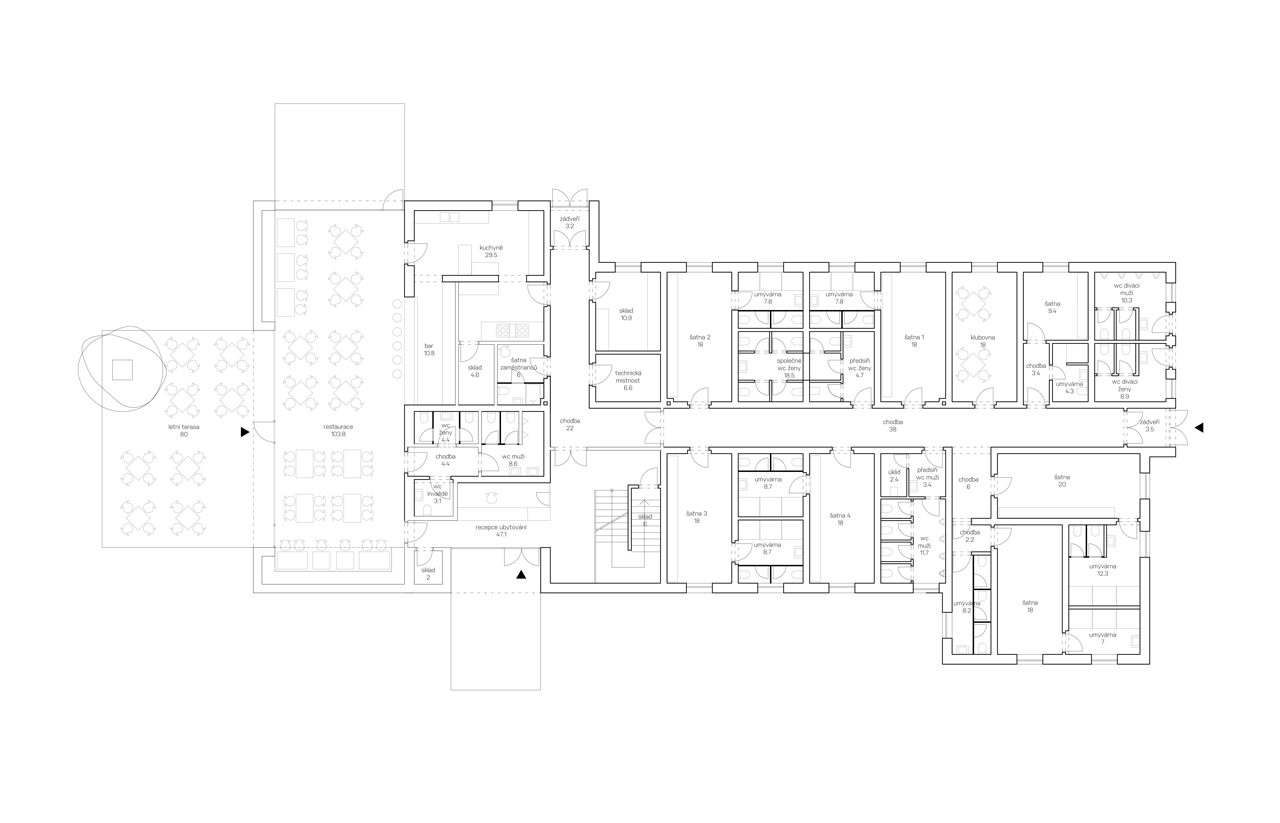 Přístupová cesta navádí návštěvníky přímo k terase, odkud vede hlavní vstup do restaurace umístěné v nové přístavbě. Vstup do ubytovací části zůstává na východní fasádě, hned proti němu je navržena recepce (sloužící zároveň jako kancelář správce), odkud se po schodišti pokračuje do dalších prostor. Sportovní klub má vlastní vstup na severní fasádě, vedle něj zůstávají i toalety pro diváky či návštěvníky přilehlých aktivit.