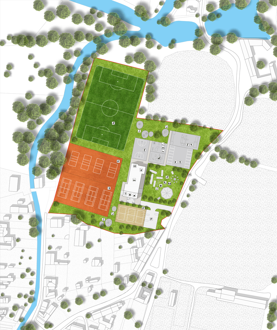 Všechny aktivity jsou umístěny dle ideální severojižní orientace sportovišť a návrh tuto stávající strukturu respektuje a vhodně doplňuje. Navržené aktivity (např. dětské hřiště, skatepark, hřiště na petanque, outdoor fitness, koše na basketball) jsou soustředěny v severovýchodní části areálu, prostor severně od příjezdové cesty zůstává volný pro příležitostné akce.