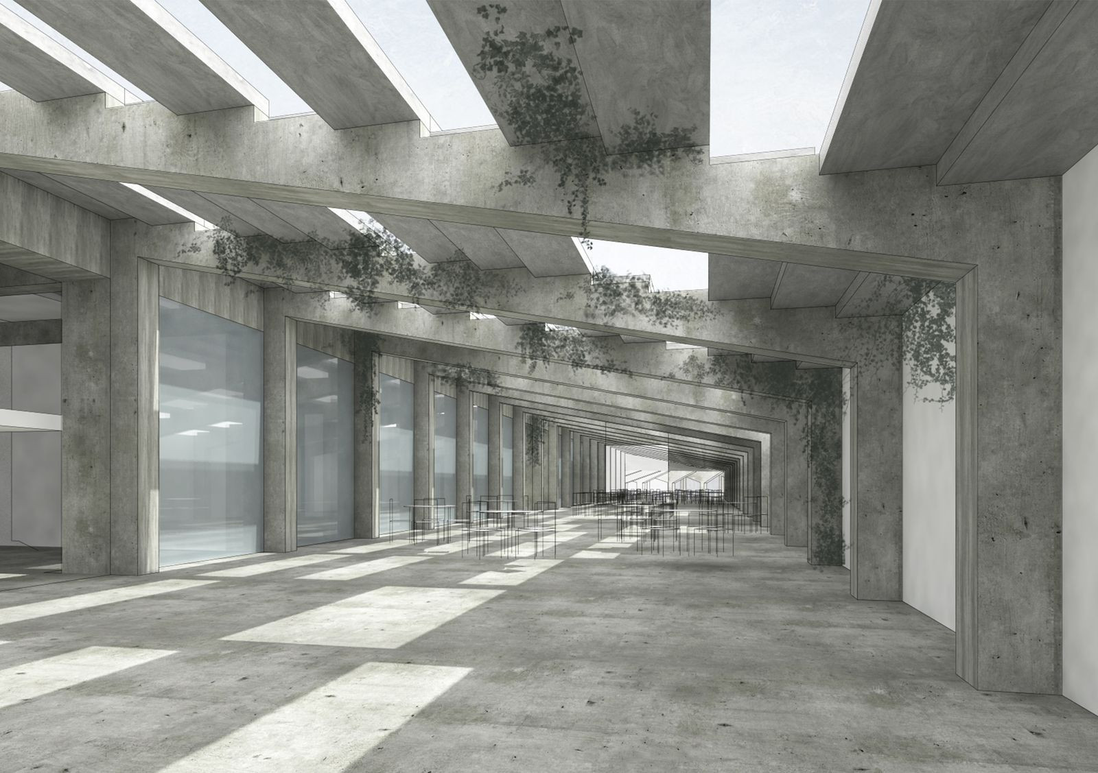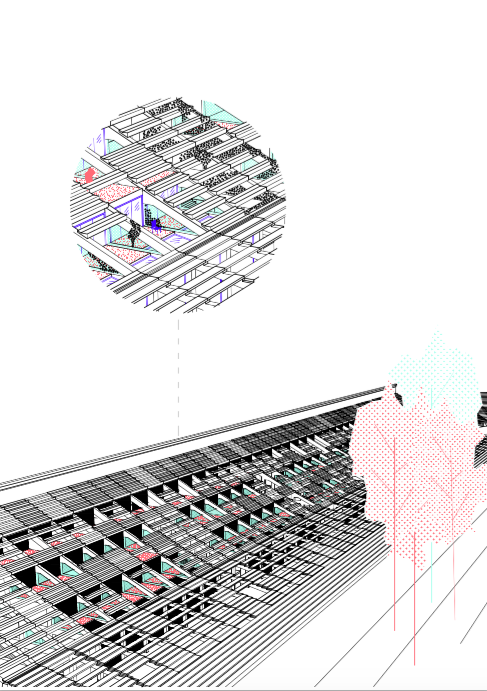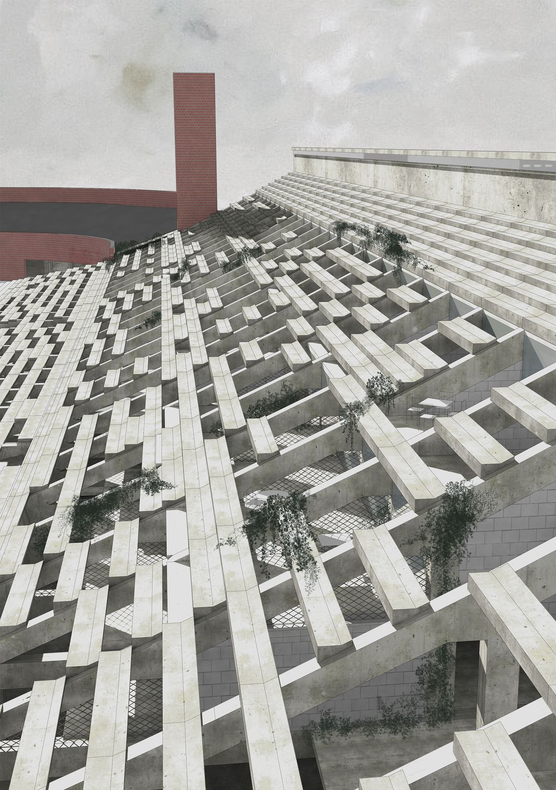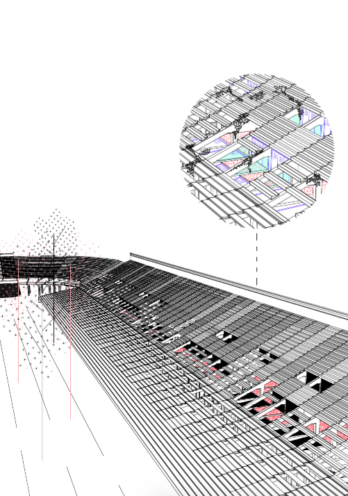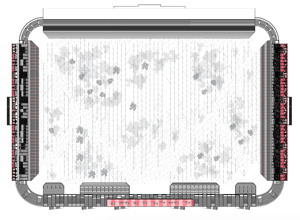Plocha stadionu. Ohraničený volný prostor. Park jako odkaz původní funkce stadionu. Masové akce vždy stojící za určitou ideologií. Sokolské slety i spartakiády se řídí přesnými pravidly, přísným řádem. Zástupy cvičenců se promítají do plochy parku. Jejich řád je narušen trasami prostupnosti, které však nemají pevnou hranici. V parku se potkává minulost stadionu s jeho přítomností. Minulost společnosti s její přítomností.