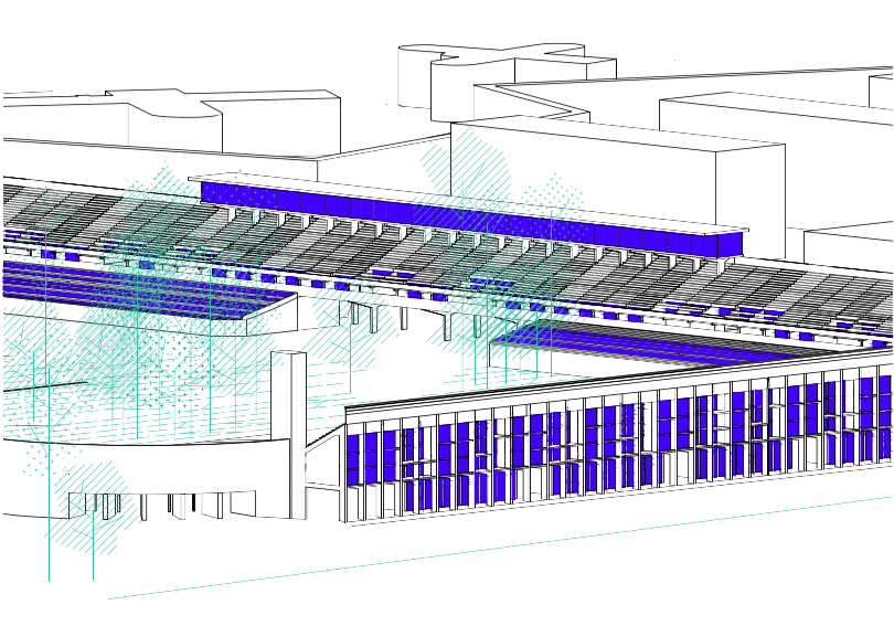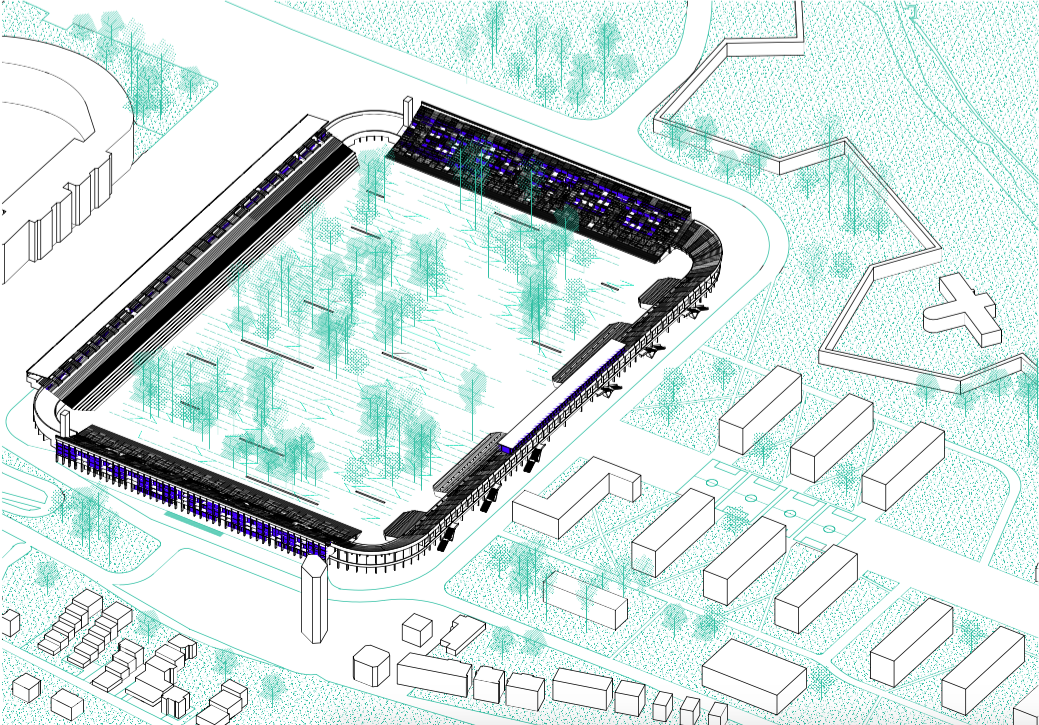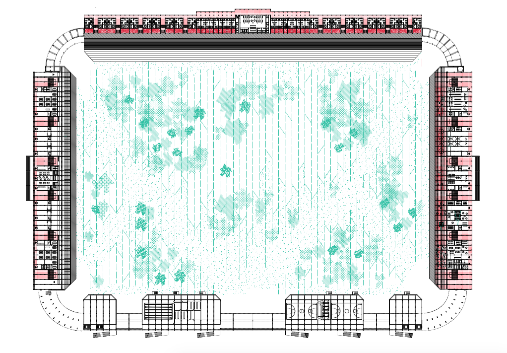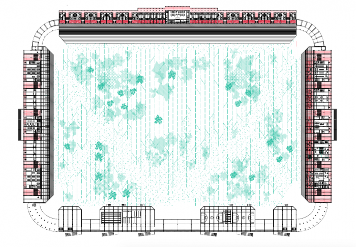 Konverze stadionu využívá jeho tribuny k bydlení se službami v parteru. Vnitřní plocha se proměňuje ve veřejně přístupný park, díky kterému se území stává prostupným. Základním principem návrhu bylo do co největší míry respektovat stadion a pokusit se udržet jeho současný vzhled. Proto jsou všechny nově navržené hmoty obsaženy ve stávající hmotě tribun a žádná tuto hmotovou hranici nepřekročí. Existence oken orientovaných do parku uvnitř stadionu je umožněna odstraňováním jednotlivých původních panelů, uložených na konstrukčních rámech, které dnes tvoří pochozí plochu tribuny. Zbývající panely slouží jako slunolamy. Hmotu tribuny, která byla odstraněna kvůli fotbalovým hřištím, návrh obnovuje.