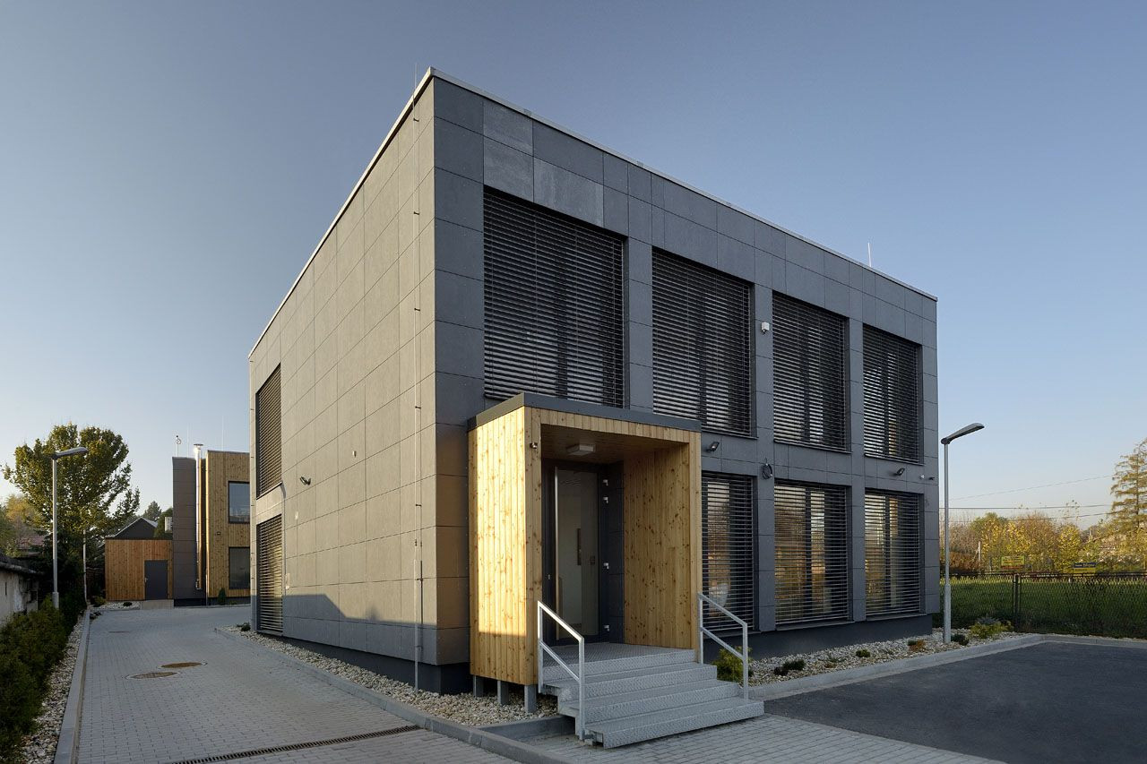 Objekt je záměrně komponován tak, aby byl zachován charakter modulového systému jak v interiéru, tak v exteriéru. Fasáda je pravidelně členěna velkoplošným zasklením, které je opatřené stínící technikou. Podobně jako u hlavního objektu firmy Steel Partner, byla použita kombinace tmavě šedých desek Cembonit na hlavní hmotu objektu a světlé modřínové dřevo pak na vstupní část. Kombinace těchto dvou hlavních materiálů spolu s jednoduchými kvádrovými hmotami se tak stává charakteristickým spojujícím prvkem obou budov.