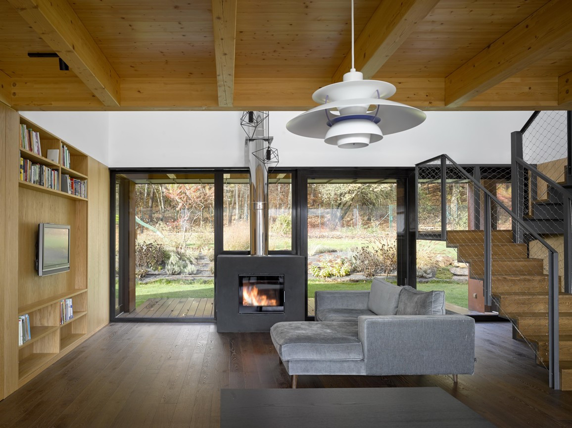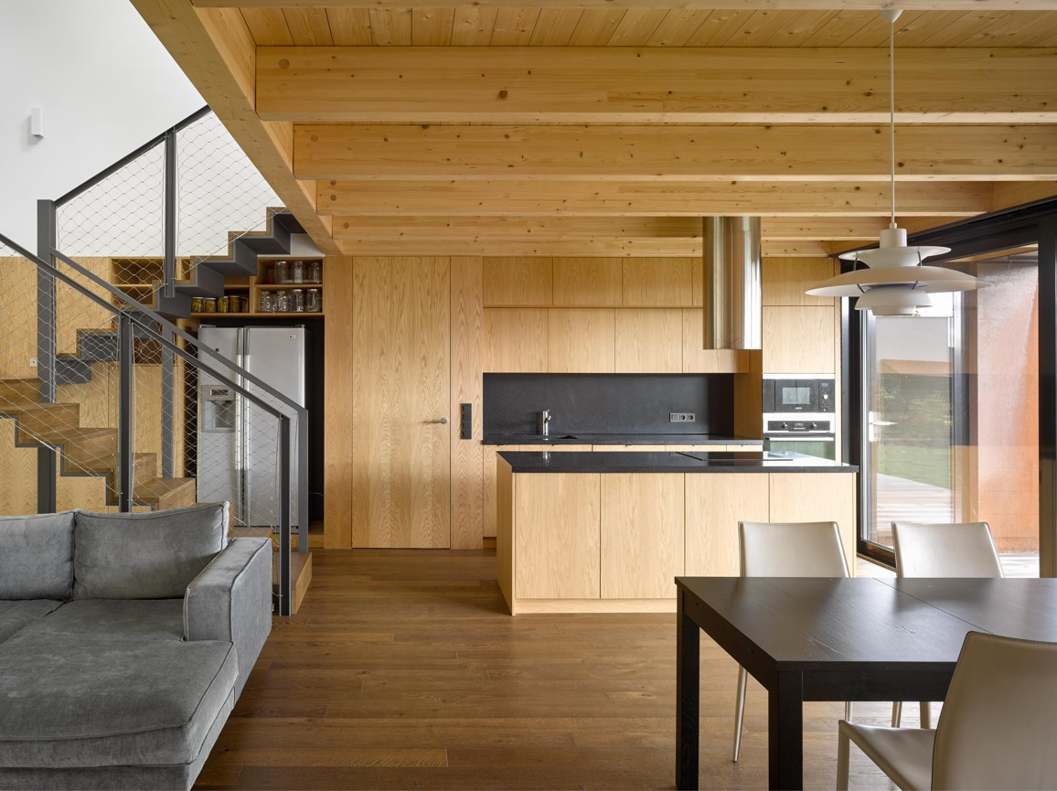 Přírodní tóny exteriéru jsou v harmonii s dřevěným interiérem v kombinaci s kovovými detaily. Obývací část je přes dvě podlaží a je prosluněná střešními okny. Prostor pro bydlení je vymezen vestavěným nábytkem na míru.