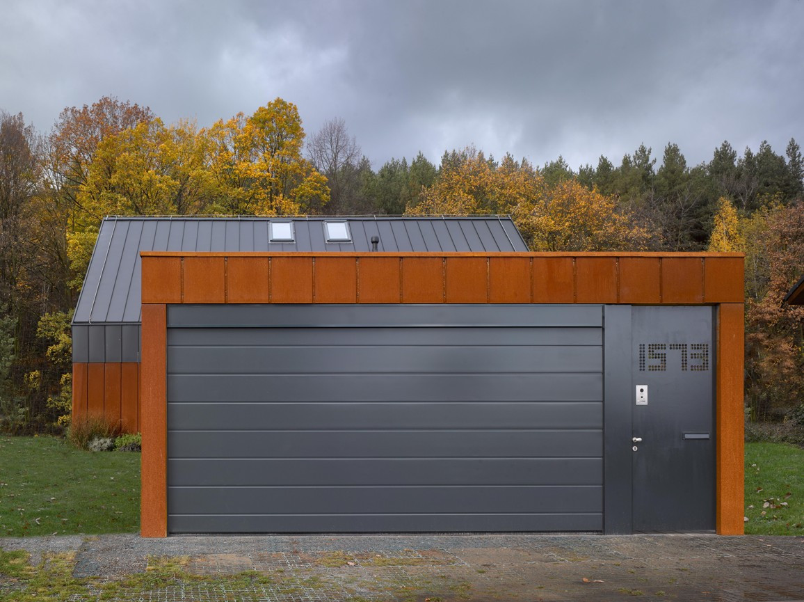 Přízemí je do výšky oken obaleno v cortenovém plášti, podkroví i se štíty do černého skládaného plechu. Materiálové členění záměrně podtrhuje objemovou hru s garáží a „dírou“, co po ní v domě zbyla.