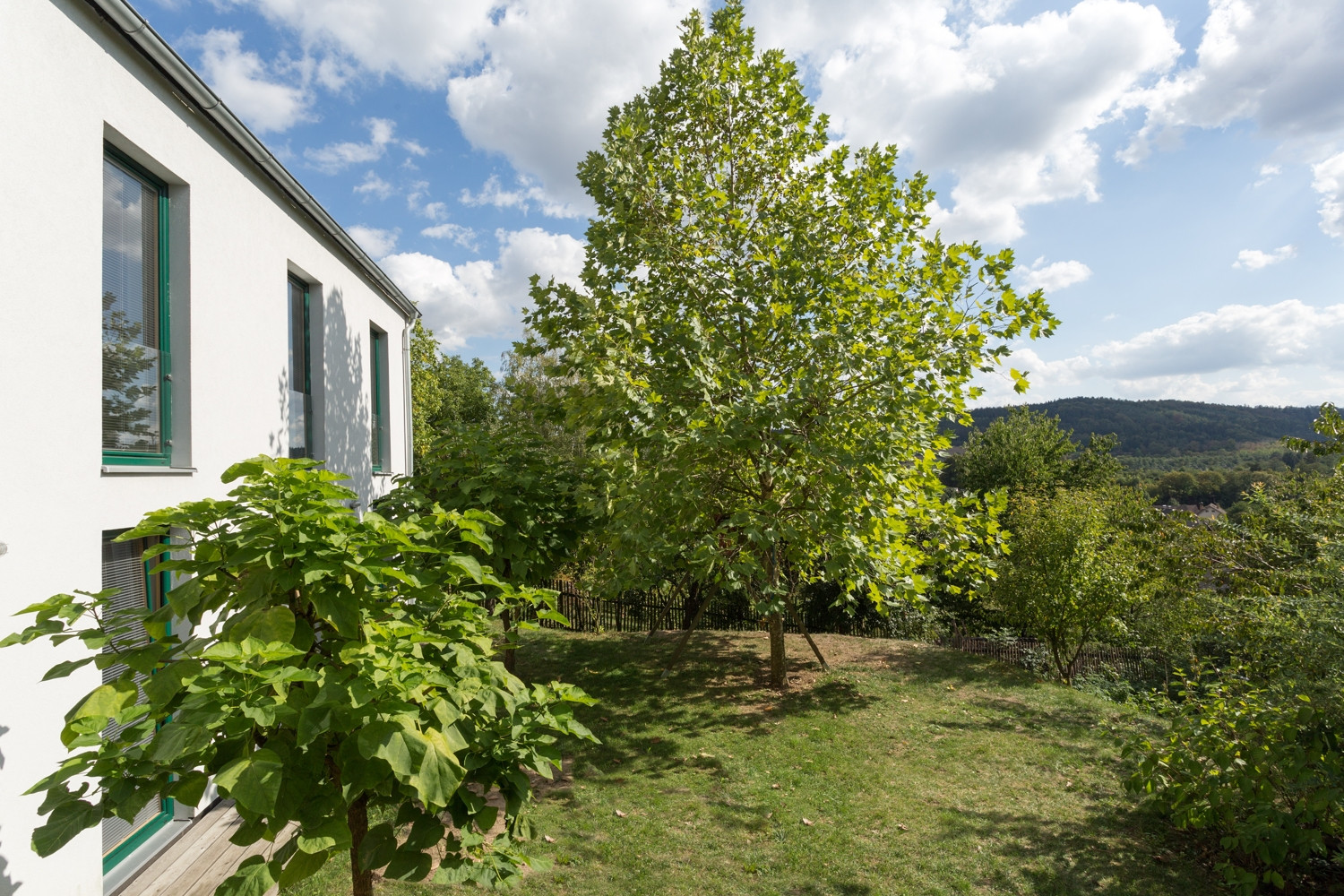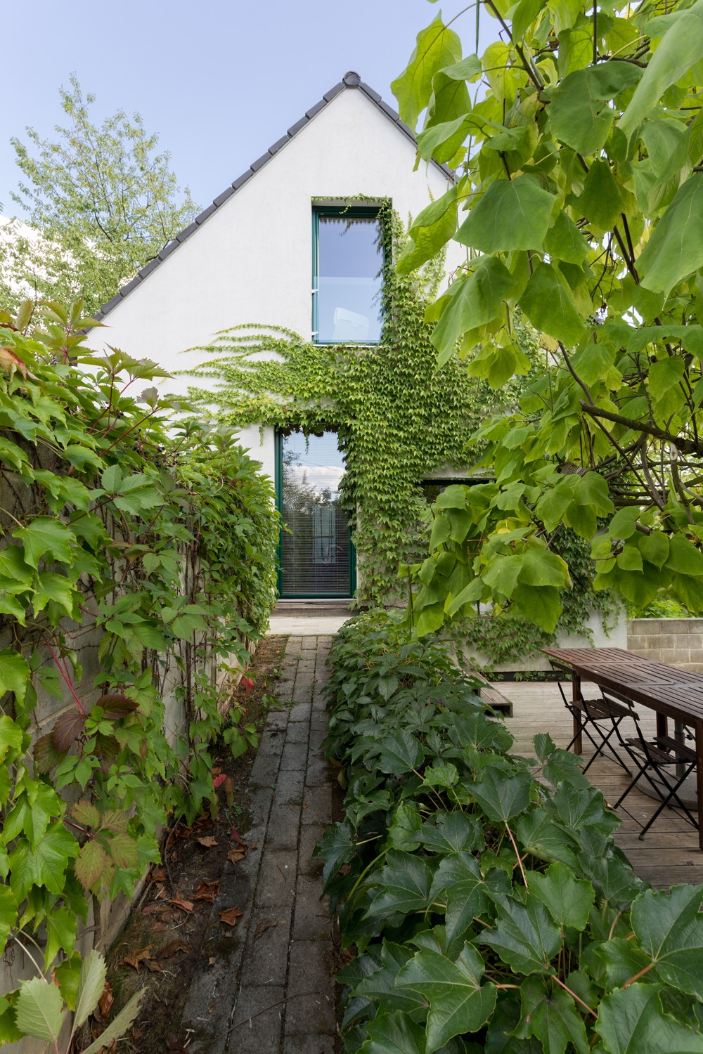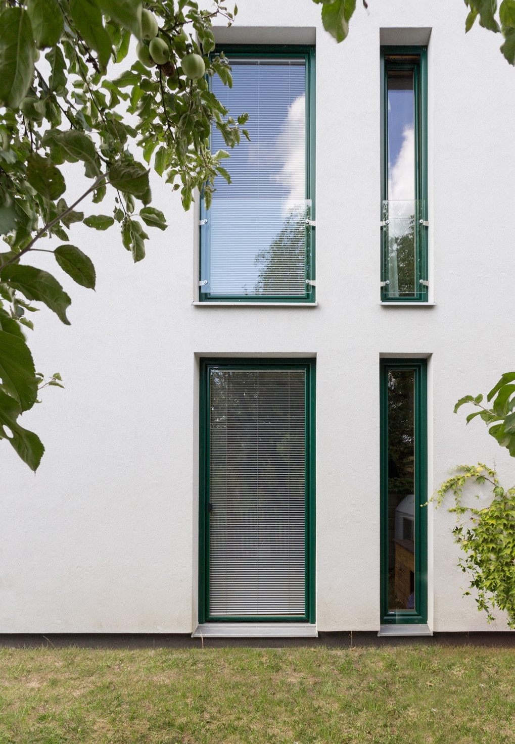Tradičně vyhlížející rodinný dům stojí ve vesnici Čakovice, na terénním zlomu v jihozápadním svahu, poblíž obory Vlková. Na výrazně převýšený pozemek se objekt napojuje díky svému třípodlažnímu uspořádání. Vstup se nachází v prostřední úrovni, na severovýchodní fasádě, a na zádveří navazuje společenská část s kuchyní, jídelnou a oddělenou pracovnou. K severozápadnímu štítu přiléhá obytná terasa. Podkroví zabírají tři pokoje pro hosty. Nejnižší podlaží pak patří třem ložnicím, všechny umožňují přímý přístup na zahradu. Výraz domu, jenž je postaven z keramických tvárnic, určuje především pravidelný rytmus francouzských oken na jihozápadní fasádě. Na bílé omítce vyniká zelená barva okenních rámů, sedlovou střechu kryjí antracitové tašky. V interiéru dominují dřevěné stropní trámy a sloupy, jež doplňuje vestavěný nábytek, na podlaze je velkoformátová dlažba.