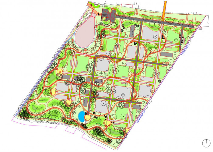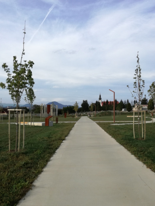 Z pôvodného návrhu zostal raster betónových komunikácií – tie určujú sektory pohrebísk (40 x 40m),ako základná komunikačná i orientačná osnova. Na takto zadefinovanú osnovu bola osadená kontrastná vrstva vlniacich sa kriviek mlatových peších chodníkov. Koncové polohy hlavných komunikácií majú cieľ – miesta s lavičkami na zastavenie, rozjímanie. Obľúbené miesto – južný cíp –zákutie s malou vodnou plochou. Dnes dokonca s rybími obyvateľmi. Vďaka, neznámemu darcovi. Prvý dôkaz prijatia tohto územia obyvateľmi..