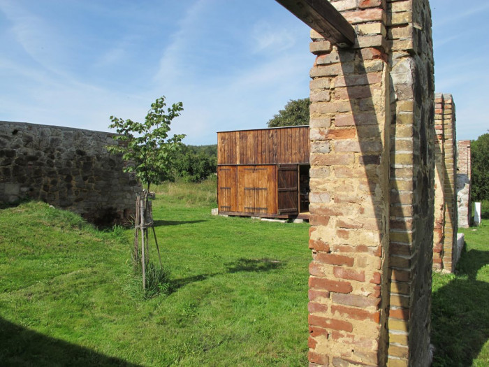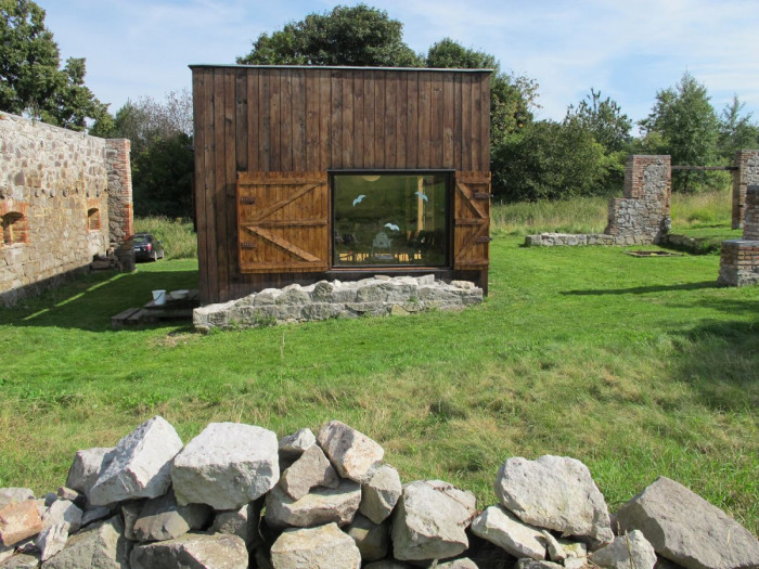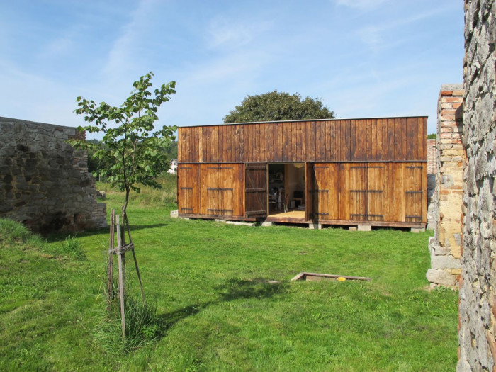 Novostavba je od severu chráněna původní masivní kamennou stěnou, jež spoluvytváří jakési vstupní závětří objektu. Objekt sám je zcela otevřen prostřednictvím pěti vrat do prostoru vymezeného zbývajícími zbytky obvodových zdí stodoly. V tomto prostoru je tak jasně definována soukromá zahrada objektu, vymezená vůči okolní divoké vegetaci.