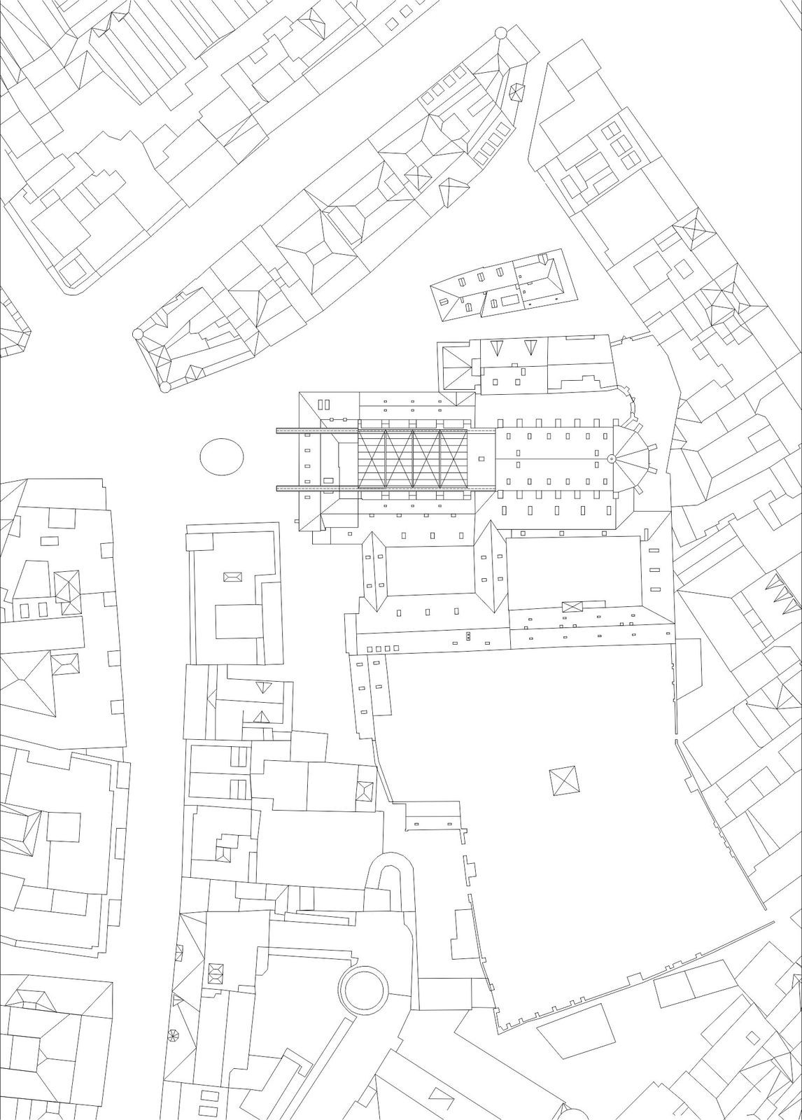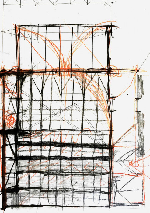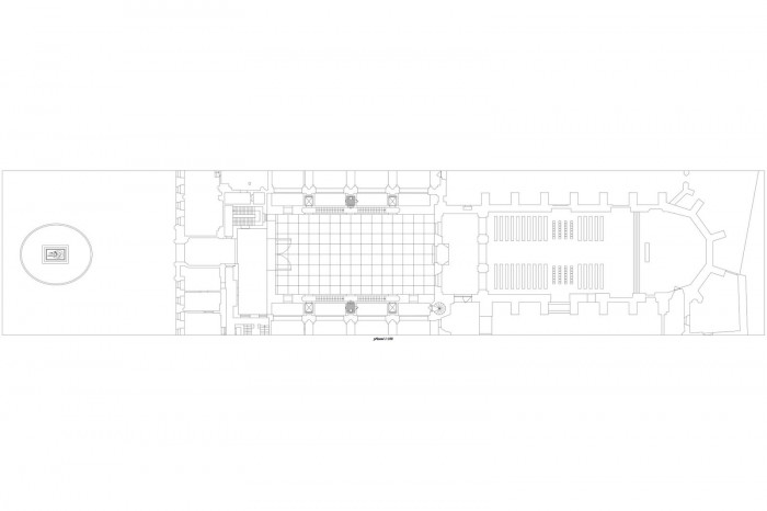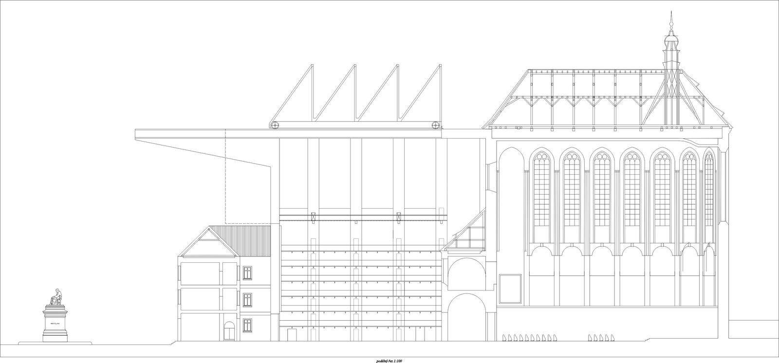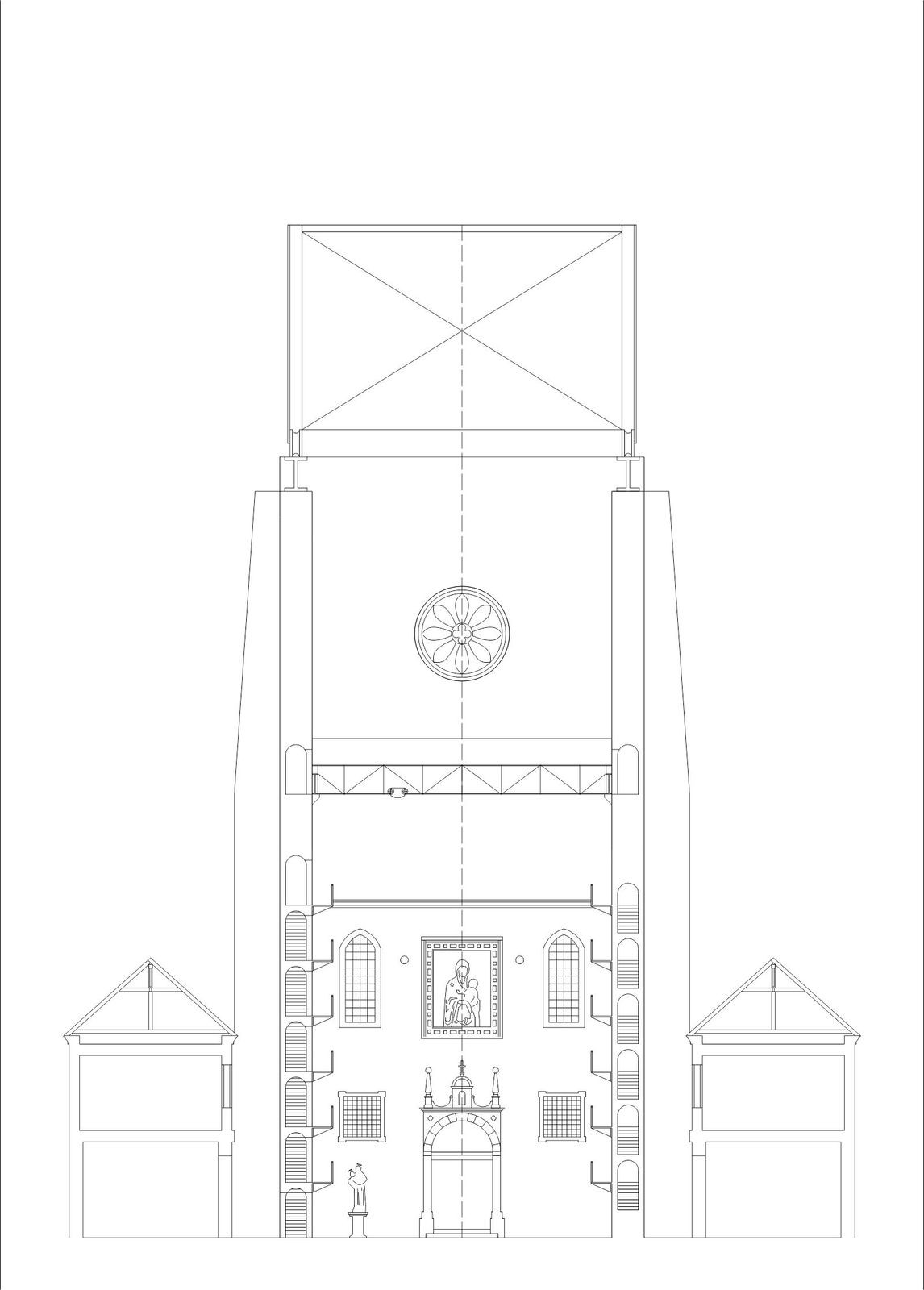Při navrhování jsem sledoval především geometrické vztahy a rastry, které jsou v místě již vepsané. Dostavuji zamýšlené stěny chrámu bez použití historizujících forem. V tlustých zdech se nacházejí schodiště, v mohutných pilířích jsou výtahy a zázemí. Projekt balancuje na hraně architektury a scénografie. Vodorovně putující střecha chrání náměstí před nepřízní počasí. Výsledkem je vysoká hala s ochozy – prázdno. Šlo mi o účinek zastřešeného náměstí. Analogii mi poskytoval Krierův projekt pro Piazza Navona, nebo Městská hala v Gentu od Robbrecht en Daem. Hala je místem pro výstavu, divadlo, nebo trh.