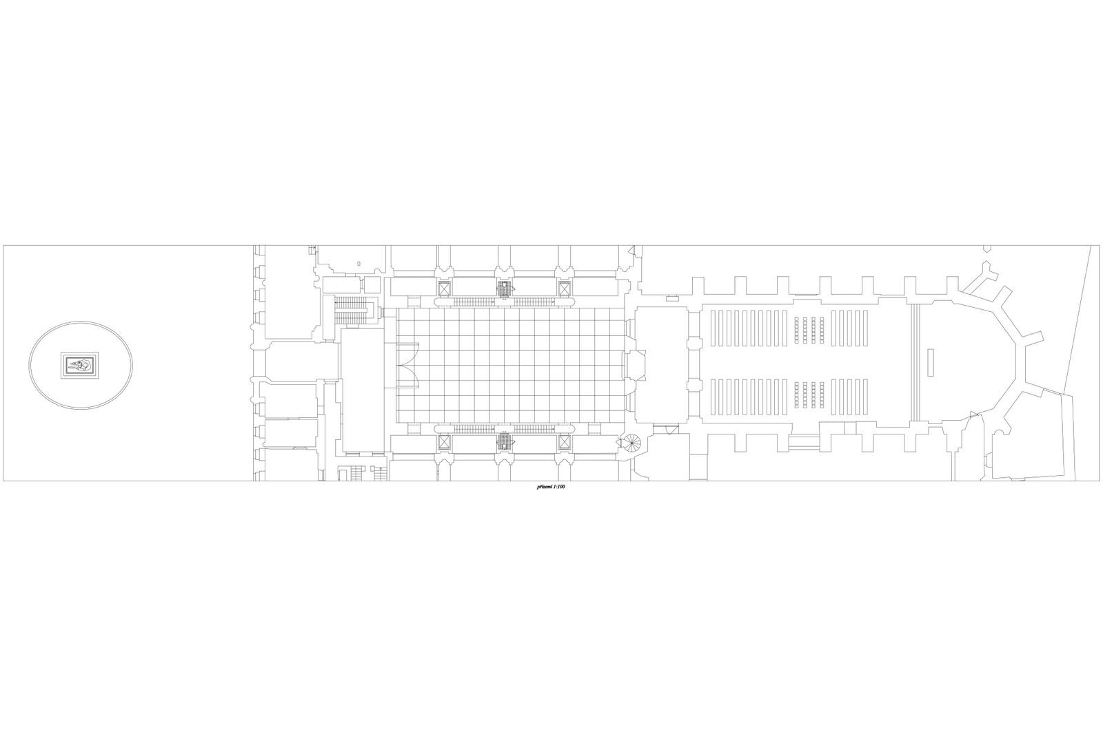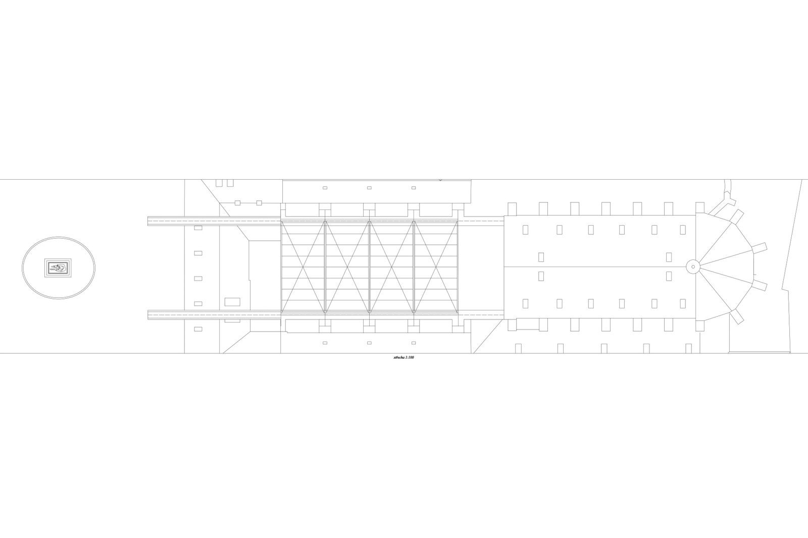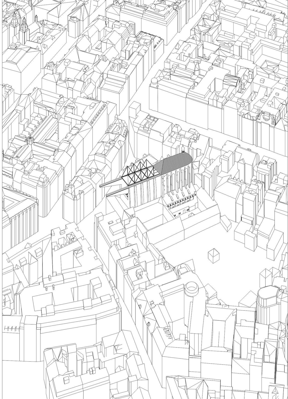 Při navrhování jsem sledoval především geometrické vztahy a rastry, které jsou v místě již vepsané. Dostavuji zamýšlené stěny chrámu bez použití historizujících forem. V tlustých zdech se nacházejí schodiště, v mohutných pilířích jsou výtahy a zázemí. Projekt balancuje na hraně architektury a scénografie. Vodorovně putující střecha chrání náměstí před nepřízní počasí. Výsledkem je vysoká hala s ochozy – prázdno. Šlo mi o účinek zastřešeného náměstí. Analogii mi poskytoval Krierův projekt pro Piazza Navona, nebo Městská hala v Gentu od Robbrecht en Daem. Hala je místem pro výstavu, divadlo, nebo trh.