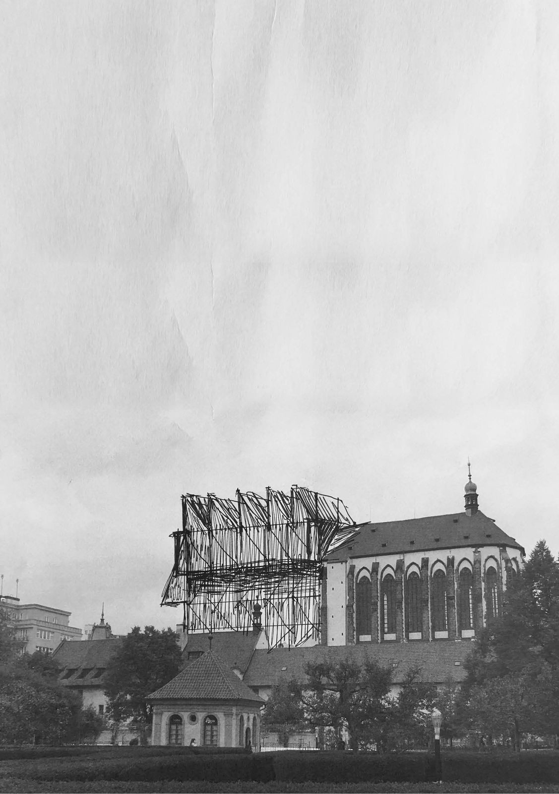 Není nic zvláštního na dostavbě domu. Navrhovat znamená nevyhnutelně přidávat. Historie je nekonečně velká a chaotická zásobárna strategií, technik, idejí, mód a zvyků. Architekturu lze chápat jako komentář, nebo anotaci existujícího textu. Nebo také jako postprodukci existujícího díla. Zjišťujeme, že každý projekt je nakonec dostavbou. Tématem práce je zkoumání potence při kostele Panny Marie Sněžné na hraně Starého a Nového Města pražského. Zabýval jsem se možnostmi aktivace potenciálu, který skýtá historická stopa nikdy nedostavěného chrámu. Místo bylo potřeba podrobit jak objektivnímu tak subjektivnímu pátrání, prostorovému zkoumání a ověřování.