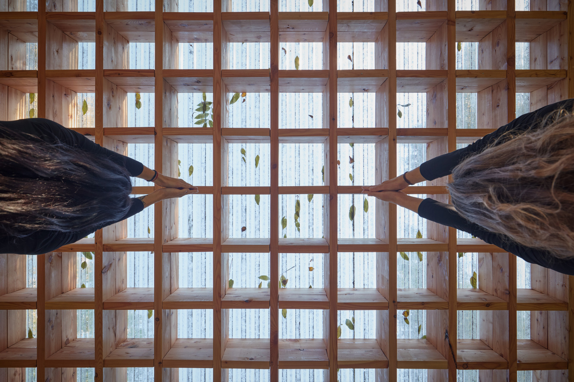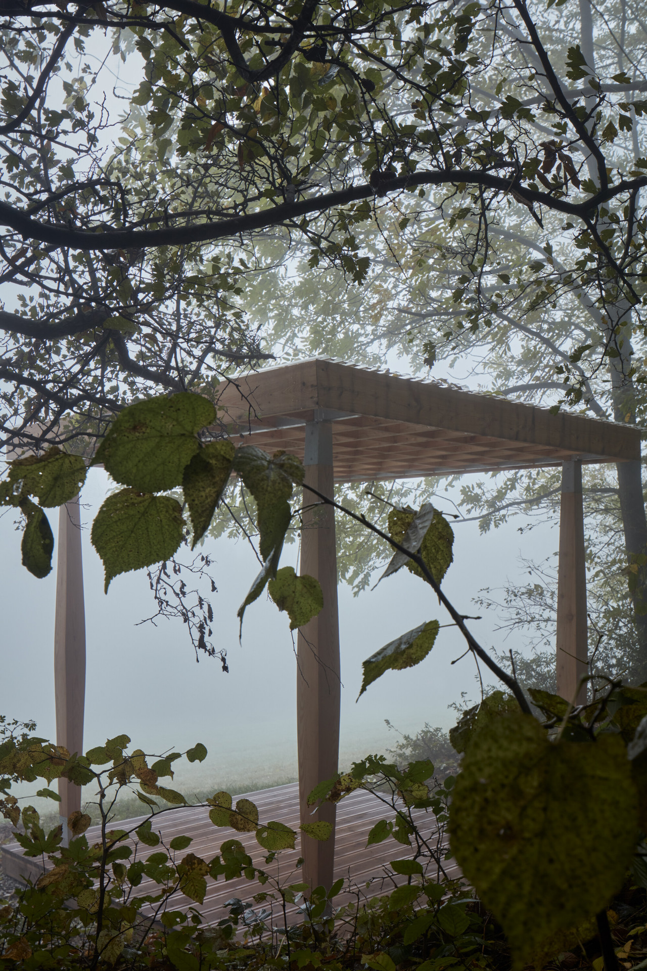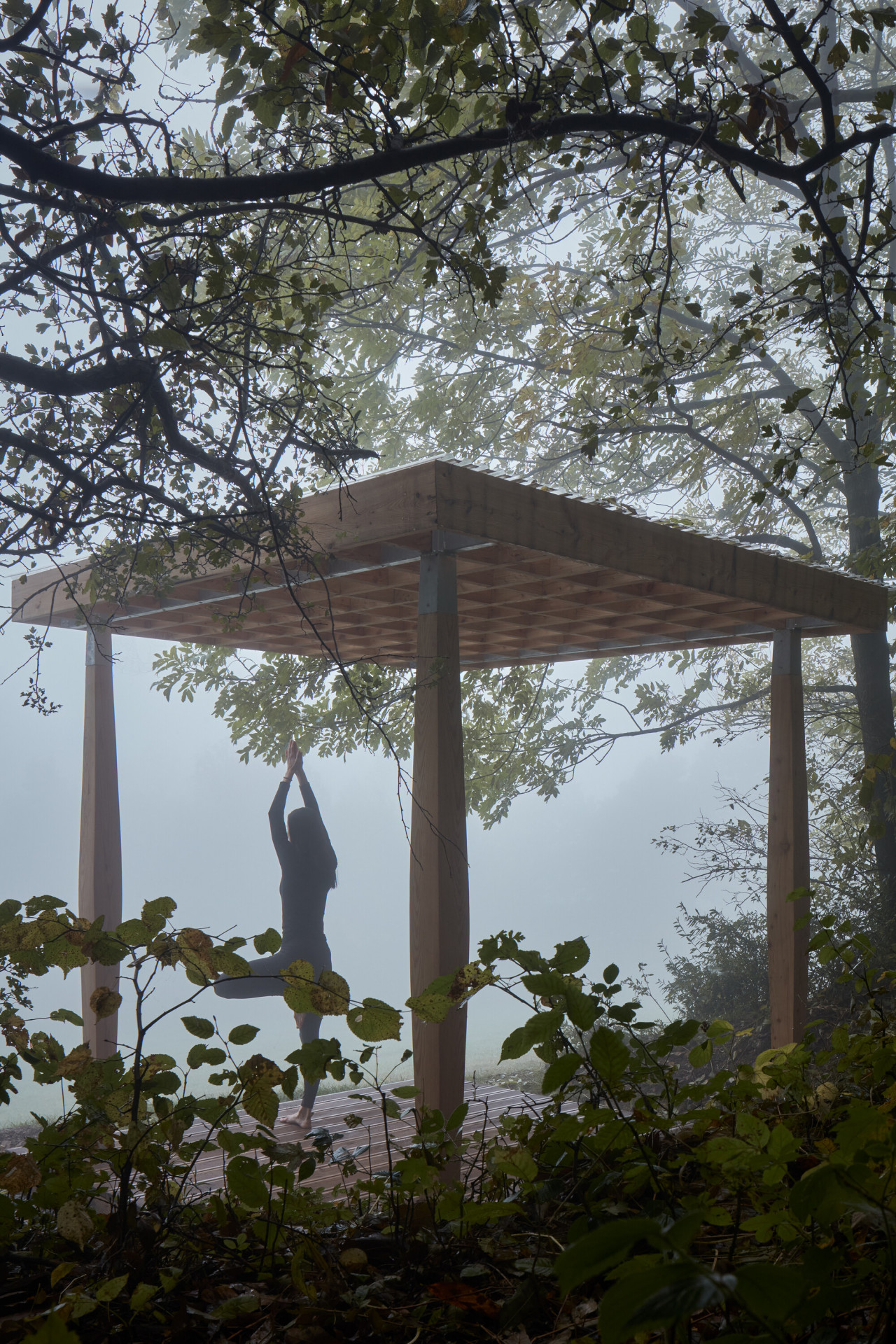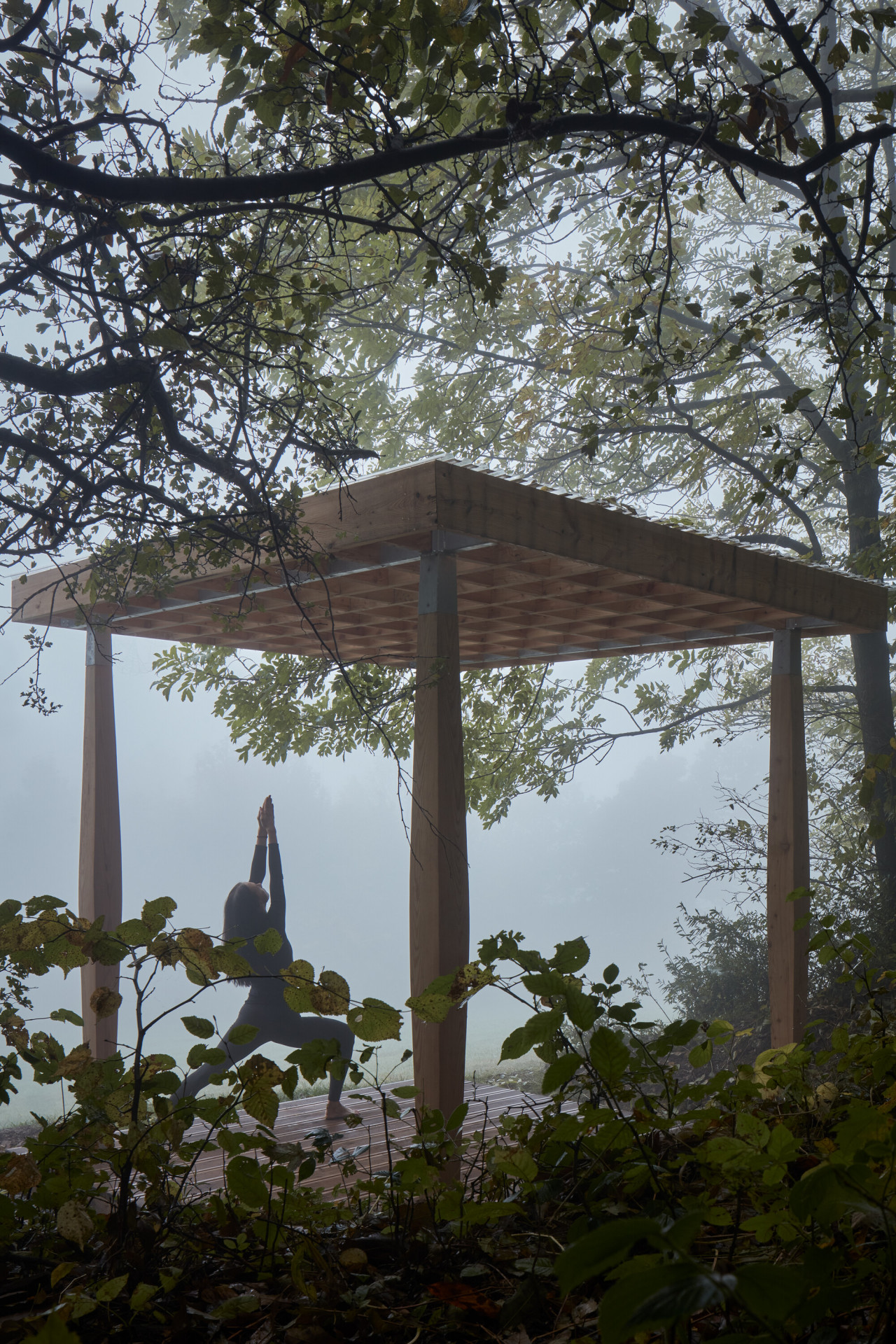 Naší odpovědí je malý pavilon s racionální konstrukcí, který nabídne prostor pro dvě cvičící osoby. Materiálovým a konstrukčním pojetím odkazuje na řemeslnou práci se dřevem, typickou pro oblast Beskyd a Jeseníků. Na čtvercové platformě stojí čtyři sloupy nesoucí rošt z fošen. Dřevěná plocha slouží jako pohodlná podložka. Symetricky rozmístěné sloupy svým tvarem navozují jistou lehkost až křehkost, přesto vnášejí do objektu stabilitu a spolehlivě nesou střešní rošt. Má funkci stínění, může se také překrýt lehkou transparentní krytinou. Návrh počítá se dvěma variantami velikostí, ta větší pojme až šest jogínů.