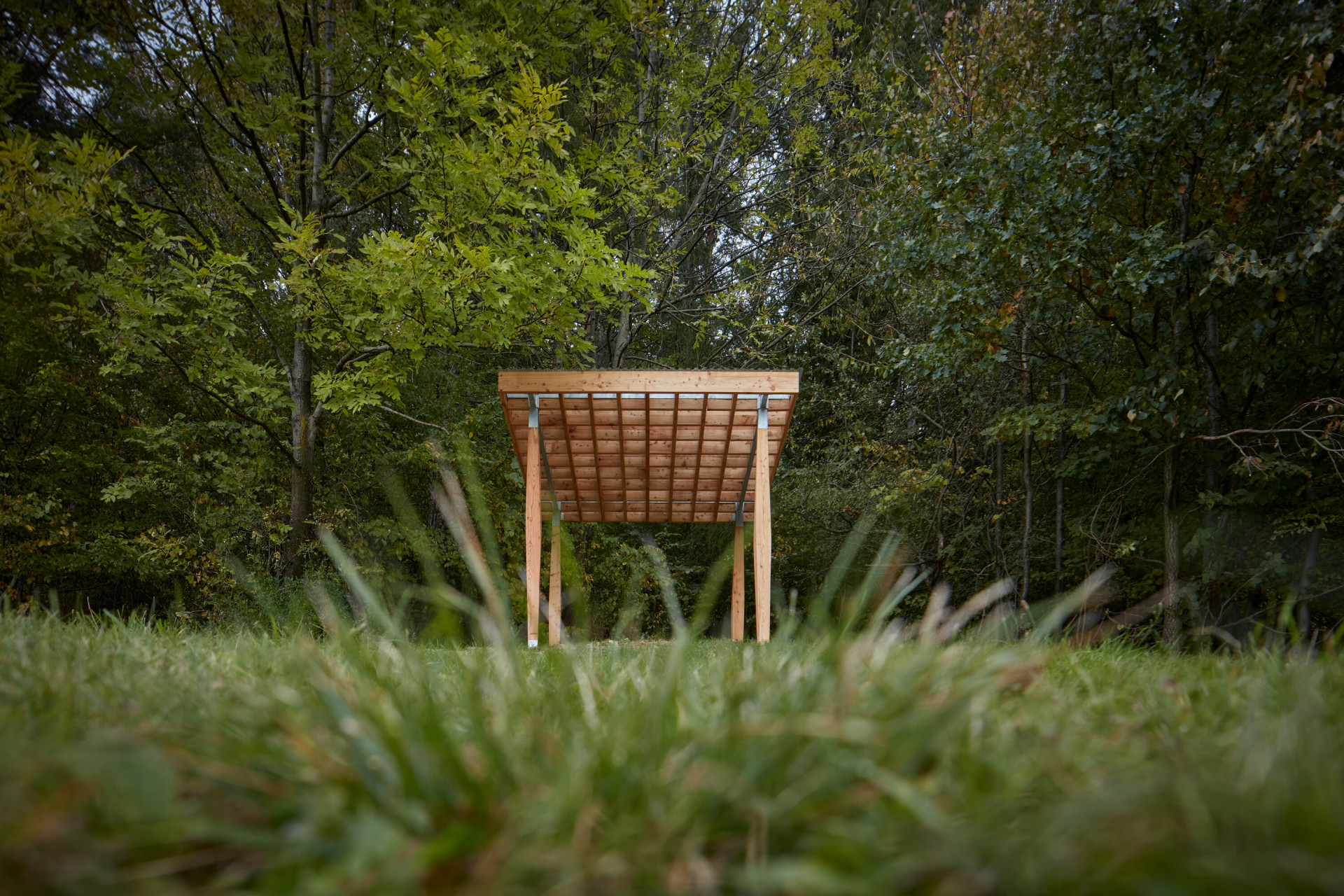 Konstrukci střechy tvoří rošt ze stínicích lamel. Jsou na sebe kolmé, vynáší je ocelový rošt tvořený dvojicí uzavřených dutých hranatých profilů. Rošt je vynášen čtveřicí dřevěných sloupů proměnného čtvercového průřezu. Sloupy jsou nejširší ve středu, ke krajům se zužují. Přechod sloupů a ocelového rámu byl zabezpečen pomocí kalichů kopírujících tvar sloupů. Sloupy se přesně vyfrézovaly a vlepily do kalichu tak, aby se vytvořil těsný spoj. Vlepení také brání vnikání vlhkosti do kontaktní plochy mezi kalich a dřevěnou hmotu sloupu. Sloupy jsou ukotveny pomocí ocelové patky s kalichem do železobetonových patek. Patky se kotvily pomocí šroubů lepených na lepidlo do betonu. Podlahu přístřešků tvoří dřevěné hranoly a prkna uložená na roznášecí betonové dlaždice. Založení přístřešků je plošné na základových patkách čtvercového půdorysu.