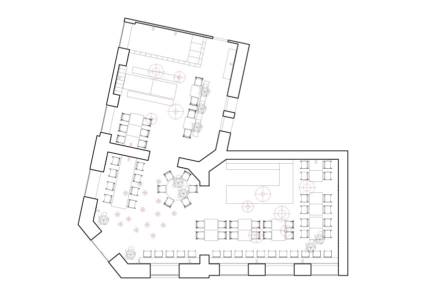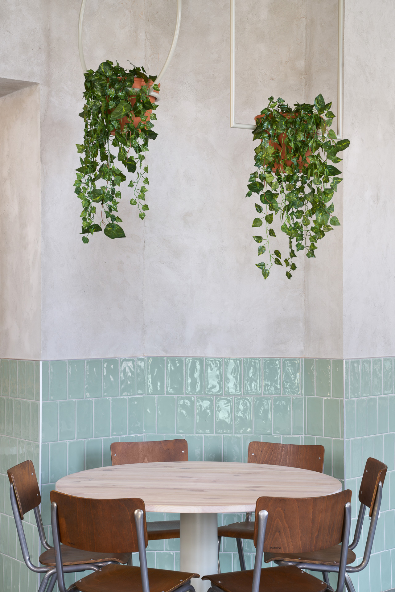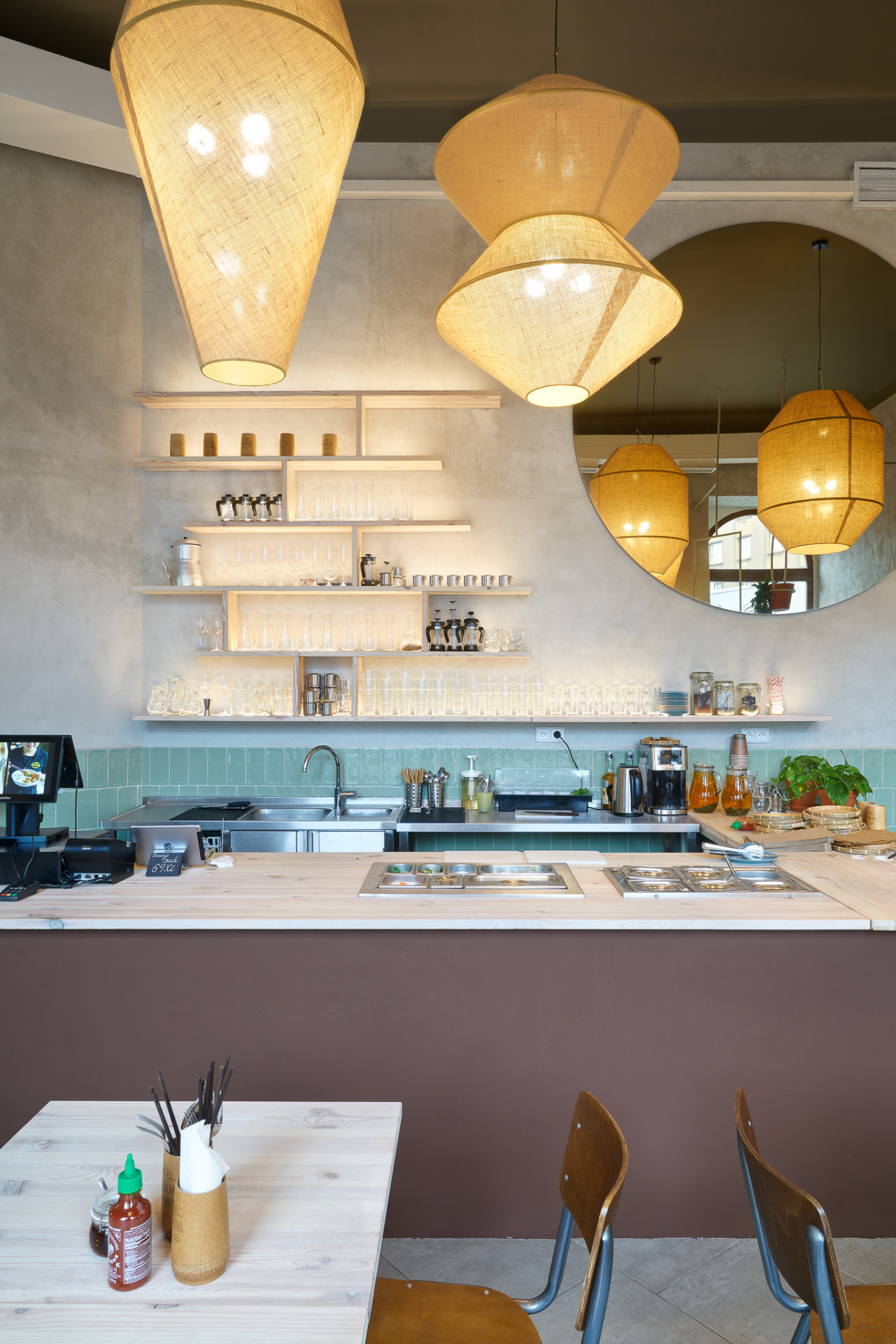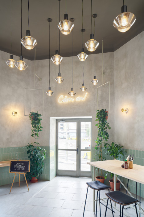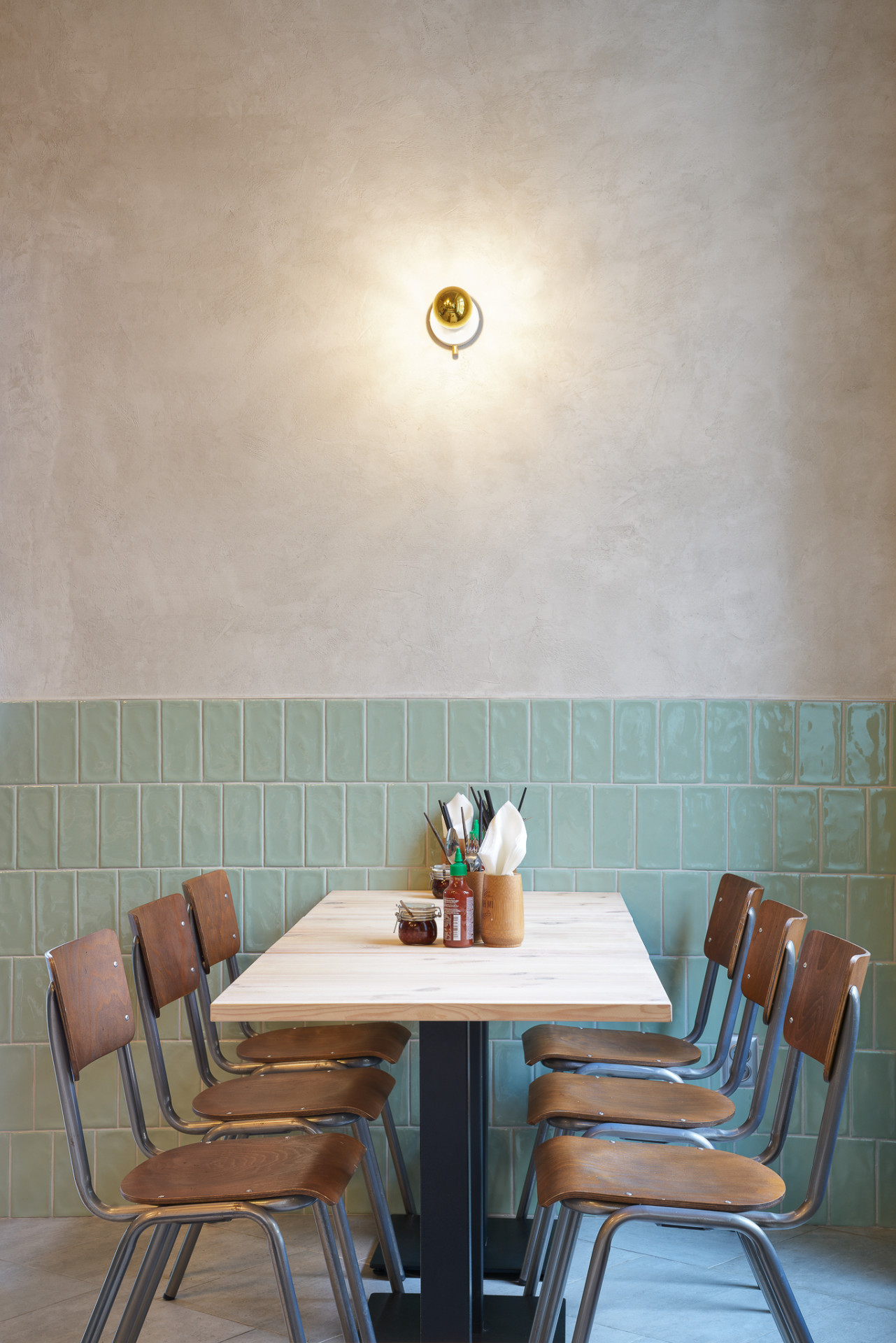 Interiér restaurace se stropy vysokými 4,5 metru je záměrně světlý a jednoduchý, stěny jsou opticky děleny podélným pásem ve svěží nazelenalé barvě. Lesklý keramický obklad zároveň slouží jako ochrana proti mechanickému odírání zdiva. Stropy mají zemitou šedivo–hnědou výmalbu, na podlaze je položena světle šedá dlažba, stěny mají vzhled běleného betonu.