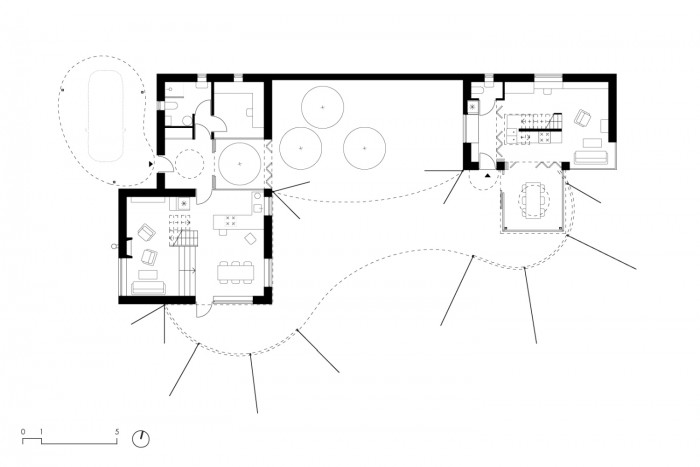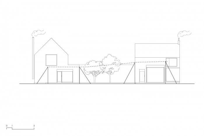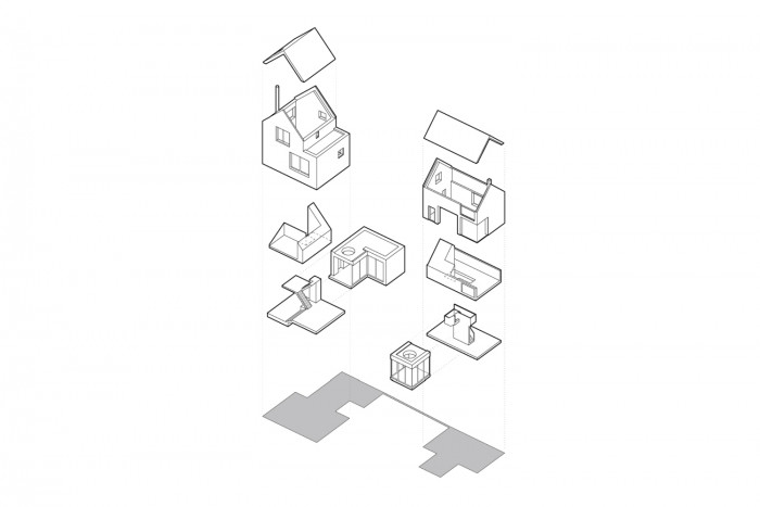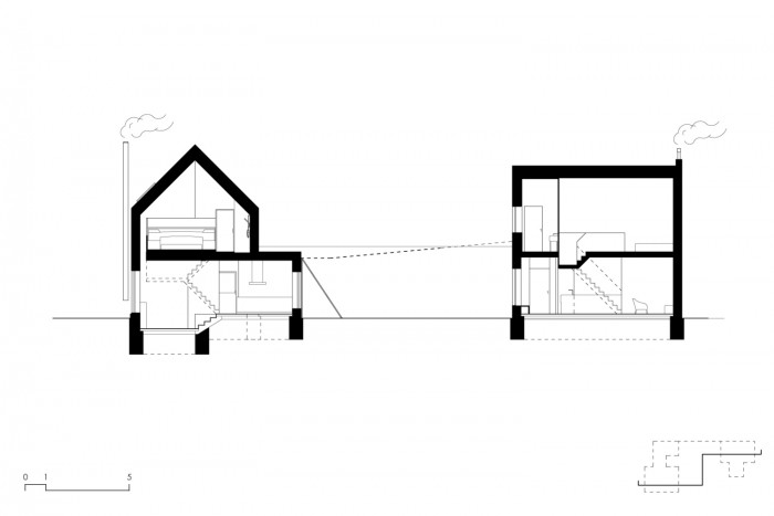 Disposice obou domů je ve svislém i vodorovném směru zcela otevřená. Nosná konstrukce stropů a schodišť byla proto zhotovena z železobetonu. Strop je betonovou blánou mezi denním a noční částí domu. Narušena je jen otvorem pro průchod litého schodiště. Pozední stěny jsou vyšší betonové mostovky s ocelovými bačkorami v jejich koruně. Úzkou půdu mohly díky tomu vyvázat pouze krokve. K nároží bližší dům učitele otevírá apsida prosklené jídelny, s kruhovým světlíkem nad stolem. Osnova denních rituálů obíhá okolo strmého jednoramenného schodiště. Ústřední motivem o něco většího domu doktora je uzavíratelné atrium orientované na východ k učiteli. Prosklenými plochami jsou z něho do kříže občerstvovány hostinský pokoj, obytná hala na jihu a malá, shora kruhovým světlíkem uzavřená, vstupní hala. Obytná hala je výškově rozdělena na kuchyň a jídelnu a popuštěné podlaží odpočinkové zóny. Na vyvěšené mezipodestě dvouramenného schodiště nachází svůj mír pracovna s podlouhlým stolem. Každý z domů má vlastní vjezd a vstup, terasu, kus své zahrady i sadu. Nad společnou zahradou se měla pnout sítěná mlha.