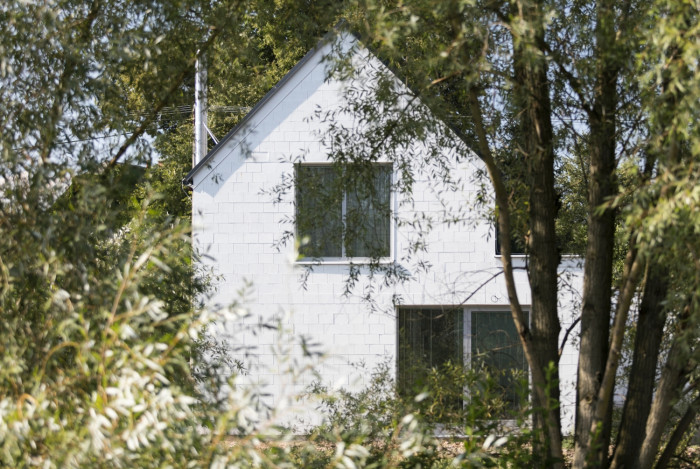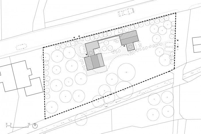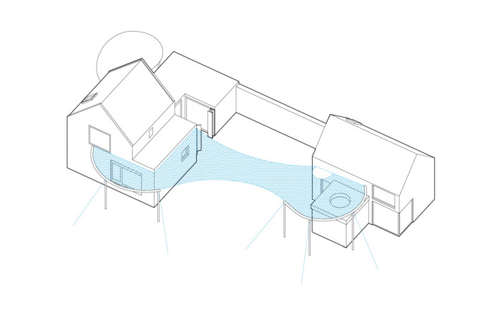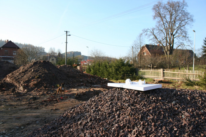 Od 16. století tu nad střechy chalup ční dřevěná starobylá zvonice. Daleko dřív si tudy však nivami koryto vymlel dravý potok Rtyňka. Jeho břehy dnes lemují nevelké zahrady s tu a tam typicky krkonošskými domky. Někam sem, mezi vodu a pulsující proud automobilů Úpické silnice, jsme položili i nové kameny Domů v mlze. Postavit dva malé domy pro dva dobré přátelé. Ustoupit potoku tak akorát a ubránit klid již odsud zmizelé chalupy před vlnami hluku. Ukrást si podkrkonošství teď. Tak se zrodil nápad těžké zdi se dvěma střídmými sochami žití za ní. Přáli jsme si vyzdít obyčejné tvarosloví rukama z betonových tvárnic a ty pak jen na bílo natřít. Do polí na jih dát domům velká okna. Každý den se svou zahradou. Každý den o trochu jiný výhled na smrčí Krákorky. Každý den přes potok lávka, nad hlavou ocelovou síť mlhy.