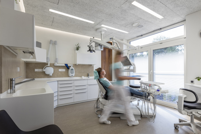 V 1. NP se kromě vstupní části s čekárnou nachází ordinace zubní chirurgie, na východní straně ordinace hygienistky a stomatologická laboratoř. Domem lze v této úrovni vyjít na jižní stranu pozemku do soukromé zahrady, vizuálně napojené na vnitřní atrium. Západní strana podlaží je vyplněna místnostmi technického charakteru – dílna se skladem nářadí, toalety pro dámy i pány, místnost OPG se serverem, technická místnost a sklad. V půdoryse jsou tyto provozy dostupné racionálně vedenými koridory v osovém ortogonálním kříži a navzájem se dle požadavků pro dobrý život uvnitř nijak neruší.