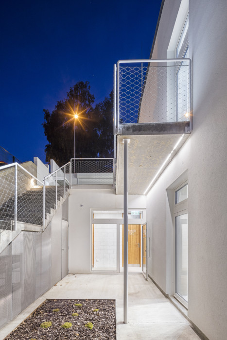 Vstupy do domu jsou díky topografii jeho okolí hned dva. Ten městský z ulice Smetanovy respektuje uliční čáru a vede personál rovnou do 2. NP. Důležitější vstup hlavní z ulice Nad Mlýnem vede přes zahradu do 1. NP a využívají jej především klienti. Záměrná dvojakost dodává domu jistotu. Vstupy určují nasazení úrovní pater a spolu s členitostí terénu i exponovanost jednotlivých fasád.