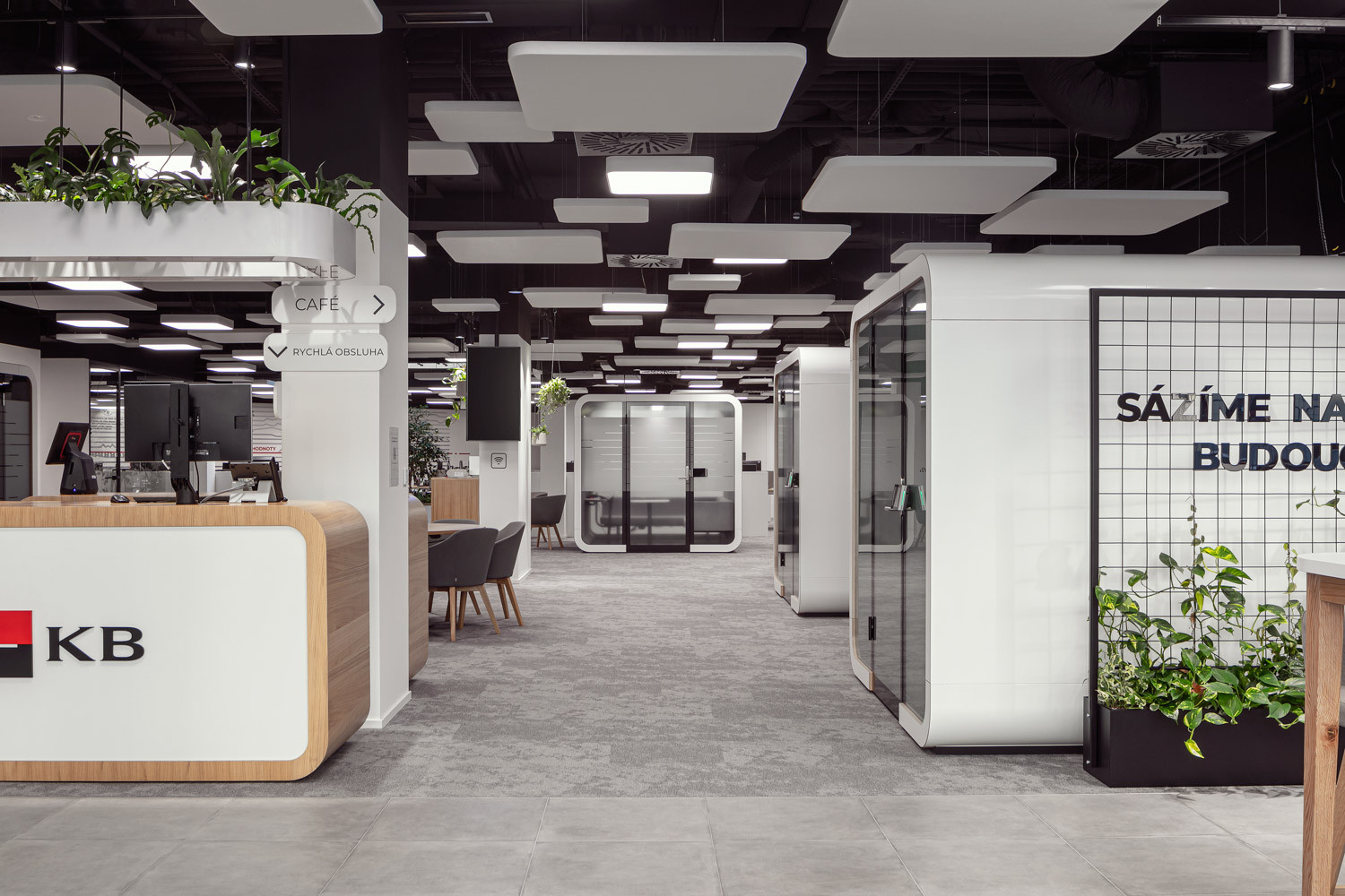 Banka láká zákazníky pomocí širokého prosklení v maximální míře, je očištěná od vizuálního smogu, doplněna LCD monitory. U vstupu je možné vybrat hotovost, využít automatickou směnárnu, získat rychlé informace o novinkách. První kontakt zajistí pracovník u dřevěného pultu, zorientujeme se díky navigačnímu rozcestníku, posadíme se do křesla.