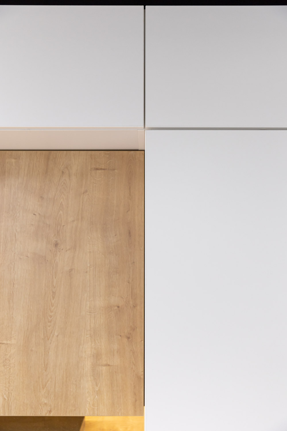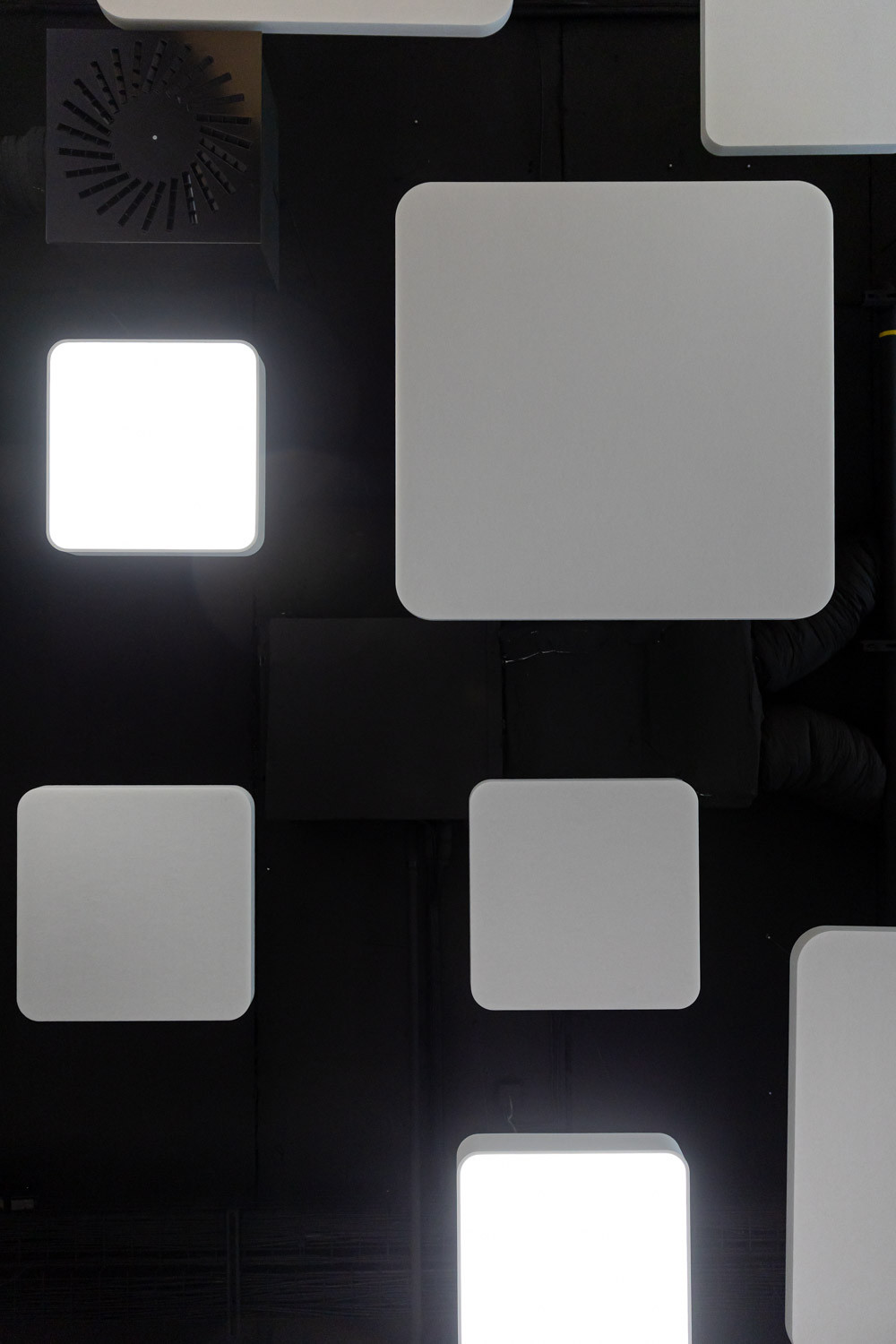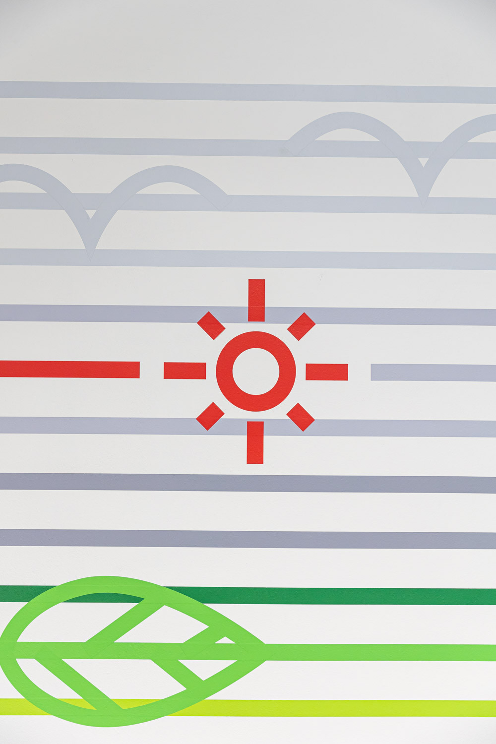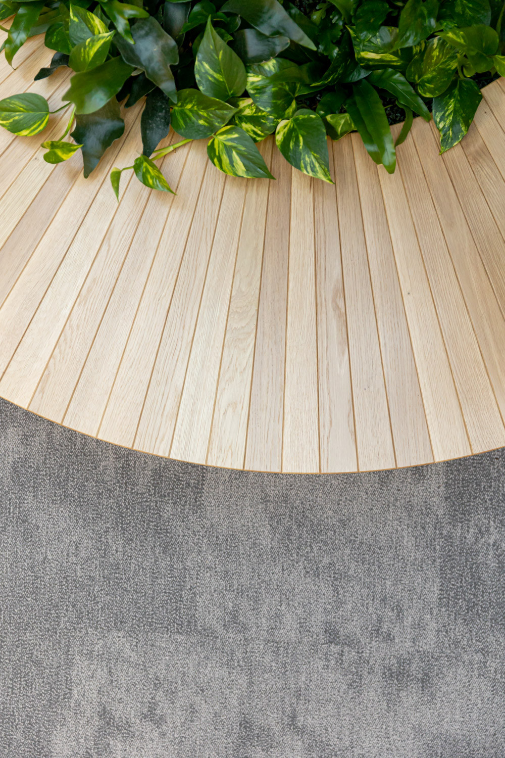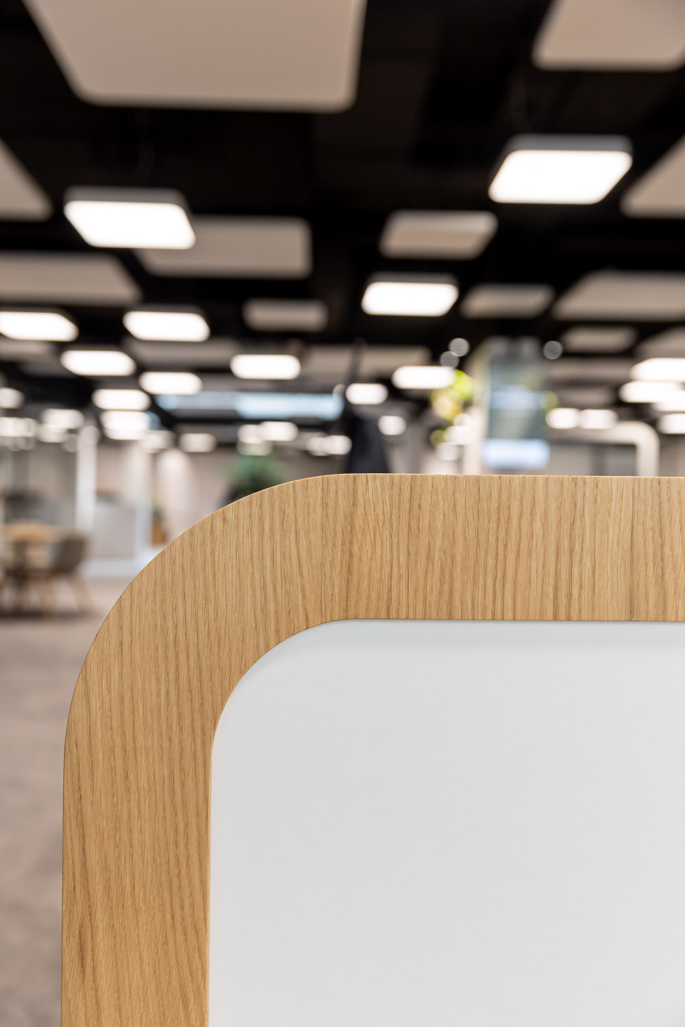 Povrchy byly vybrány v základních odstínech černobílé. Místa, kde tráví uživatele nejvíce času jsou navržena z přírodních materiálů (dřevo, marmoleum, atd…), doplněny množstvím rozmanité zeleně. Červená korporátní barva zmizela, prostor upozaďuje svou důležitost, nechává vyniknout zákazníka.