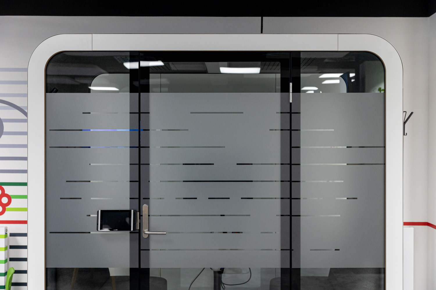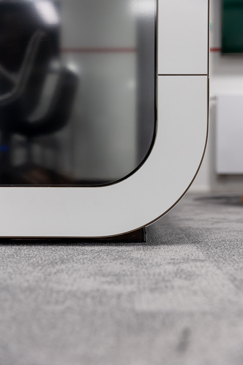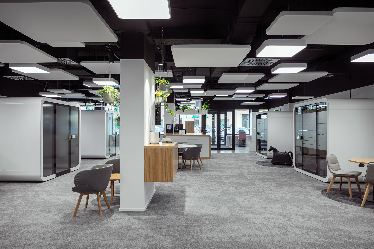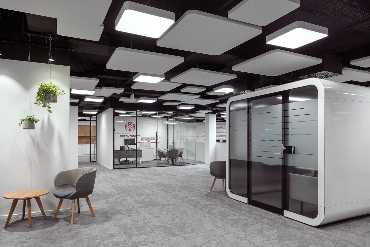 K projednání záměrů s vyšší diskrétností v jednacích budkách slouží středový lounge. Zaměstnanci banky mají svou coworkingovou zónu v blízkosti přirozeného světla pod světlíkem.