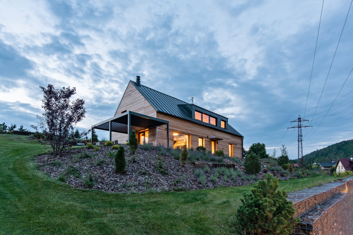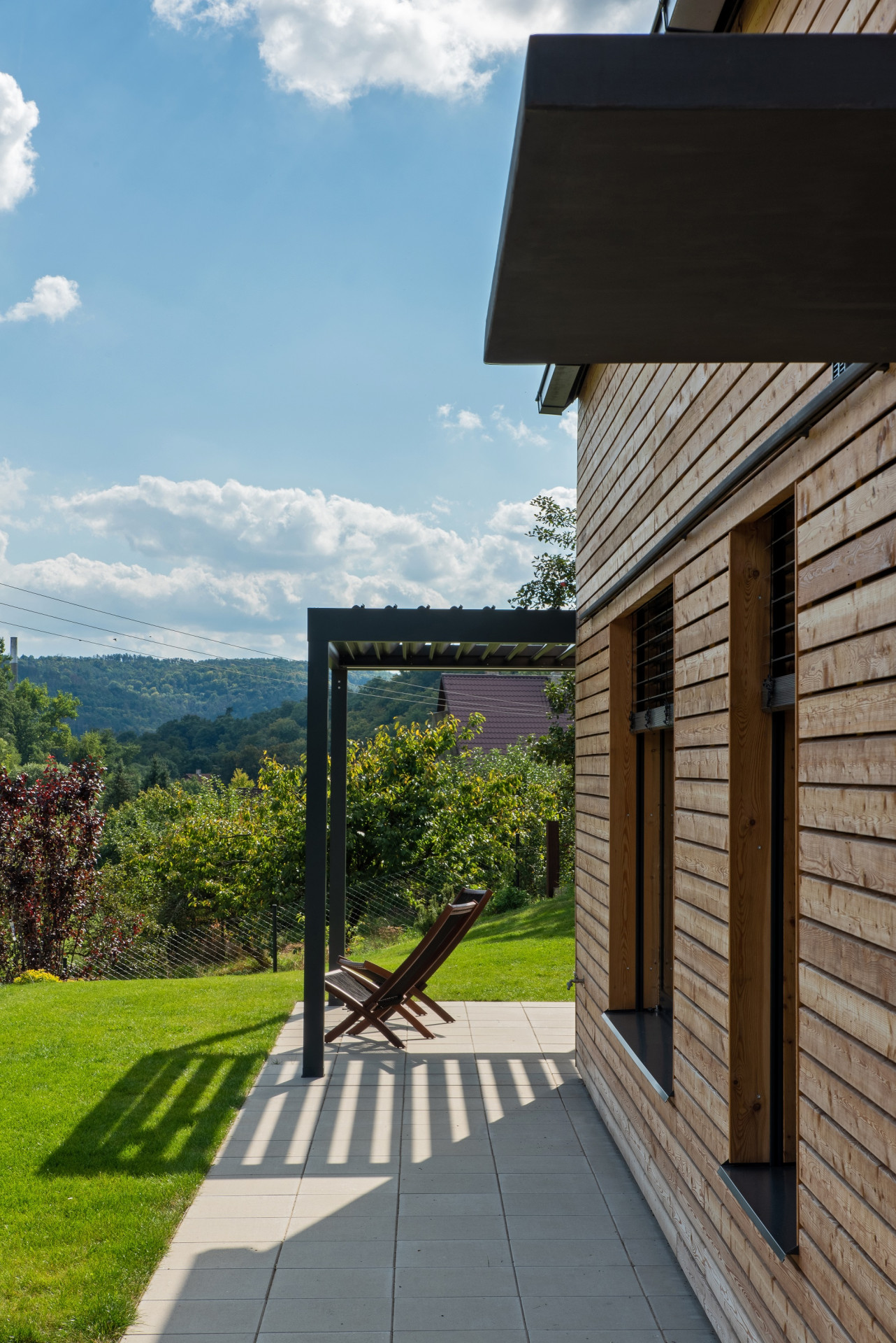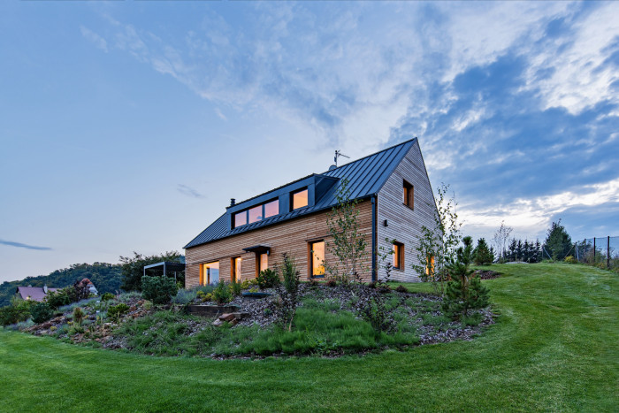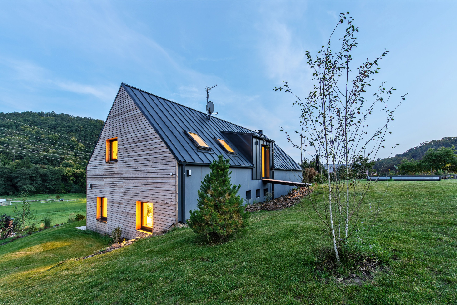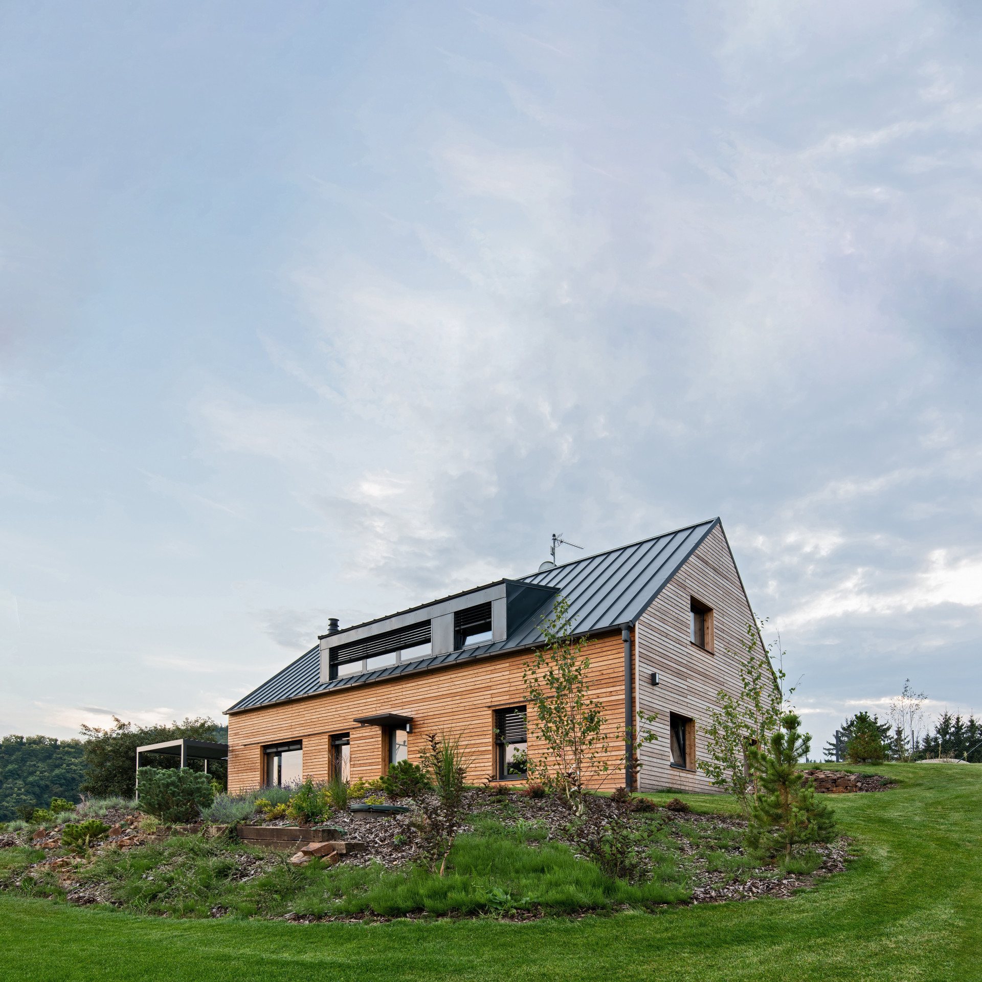 Rodinný dům v Chrustenicích umístěný ve svahu hledí na stráně podél řeky Loděnice