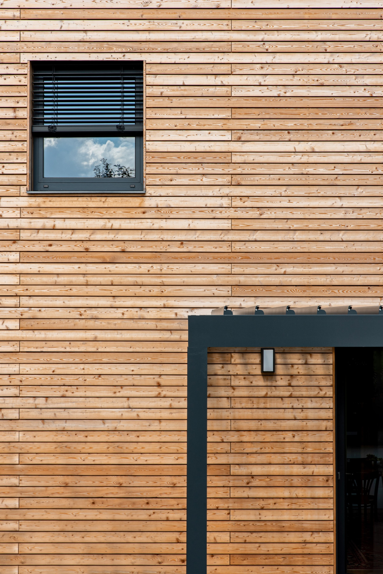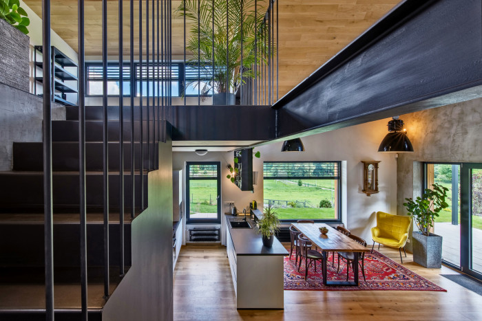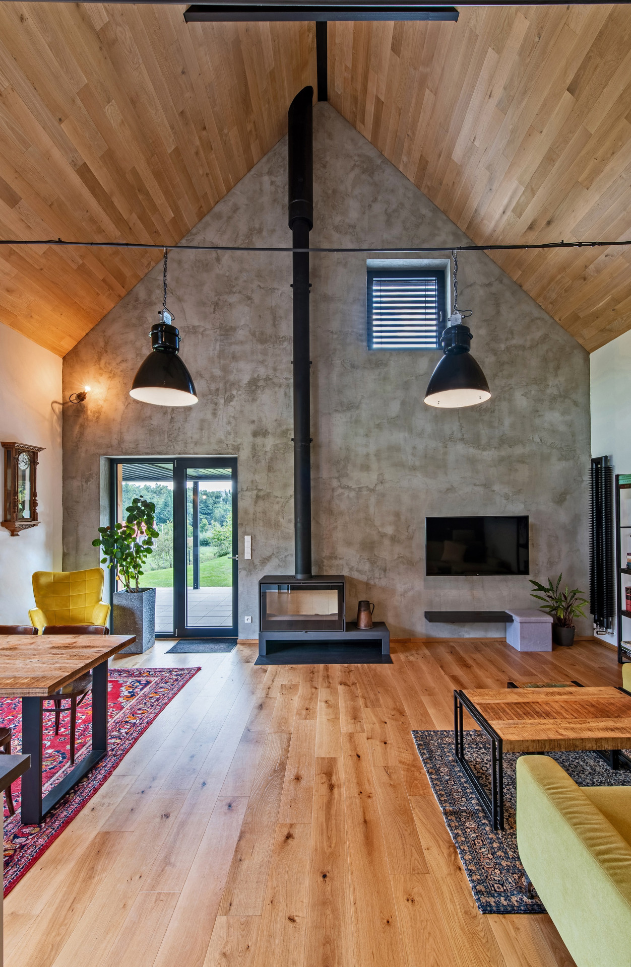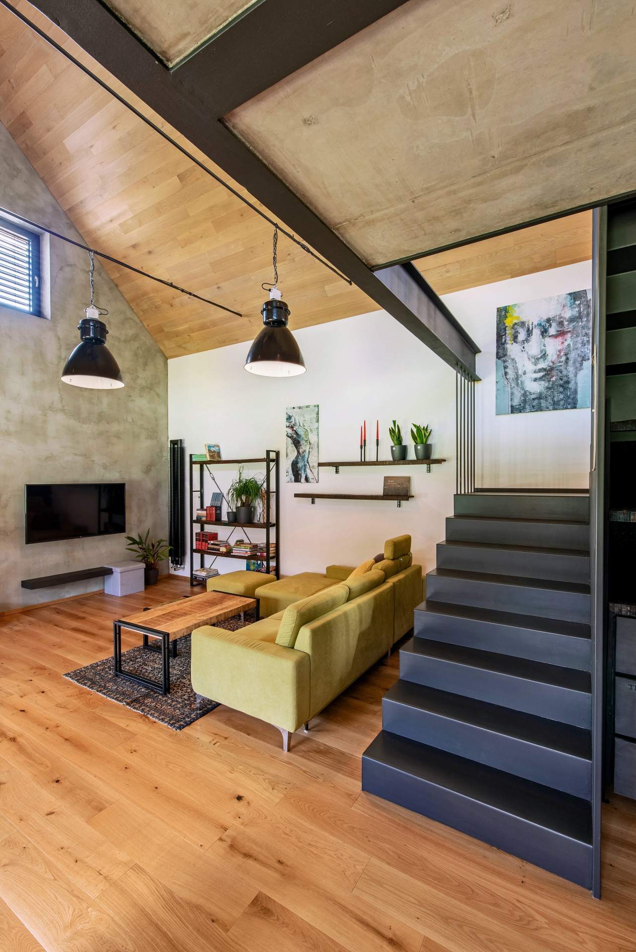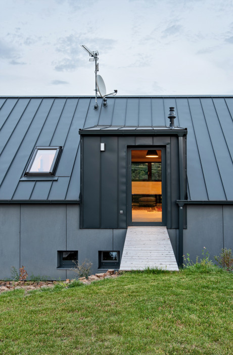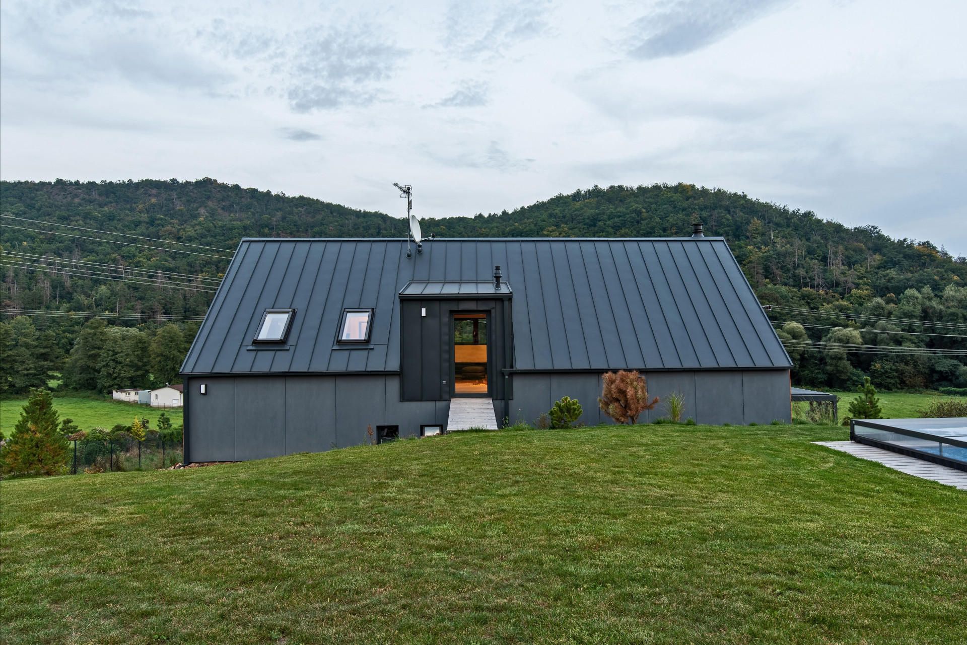 Při volbě materiálu jsme jen volně navazovali na přání klienta. Surová ocel, pohledový beton, „kleťák“ na podlaze, kovářskou černí natřené „roxory“. Vnější obklady jsou provedeny ze sibiřského modřínu, plechová střecha spolu s okenními rámy ladí v antracitové barvě.