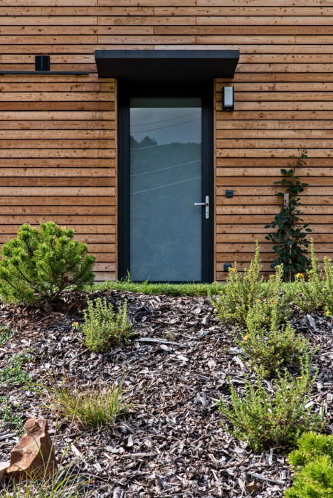 Nejkrásnějším momentem celého pozemku je výhled na Loděnický potok se strání porostlou listnatými stromy. Svažitý pozemek umožnil dvoupatrový dům zasadit hmotově do terénu tak, aby byl přístupný z obou úrovní. Tvar domu je obdélníkový s šikmou střechou orientovanou hřeben po vrstevnici. Příjezdová cesta pod svahem je zakončena parkovacím přístřeškem pro 2 auta. K domu je z jižní části přistavena lehká terasa s grilovacím místem.