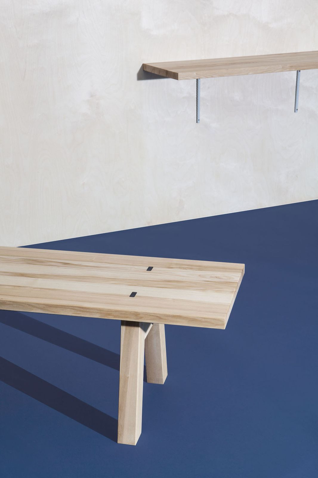Lavice . BenchRozměry . Dimensions:2000 x 450 x 450Lavice z masivního dřeva s výrazným konstrukčním detailem odkazuje k tradičním truhlářským spojům. Ačkoliv forma nemá ambice být inovativní, myšlenka reflektuje současnou společenskou atmosféru. V práci trávíme více času a potřebujeme dostatek sociální interakce a kvalitní prostředí. Nové produkty podporují diverzitu na pracovišti. U široké lavice a velkého stolu lze pracovat, nebo se bavit a odpočívat...