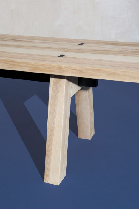 Lavice . BenchRozměry . Dimensions:2000 x 450 x 450Lavice z masivního dřeva s výrazným konstrukčním detailem odkazuje k tradičním truhlářským spojům. Ačkoliv forma nemá ambice být inovativní, myšlenka reflektuje současnou společenskou atmosféru. V práci trávíme více času a potřebujeme dostatek sociální interakce a kvalitní prostředí. Nové produkty podporují diverzitu na pracovišti. U široké lavice a velkého stolu lze pracovat, nebo se bavit a odpočívat...