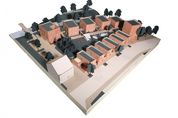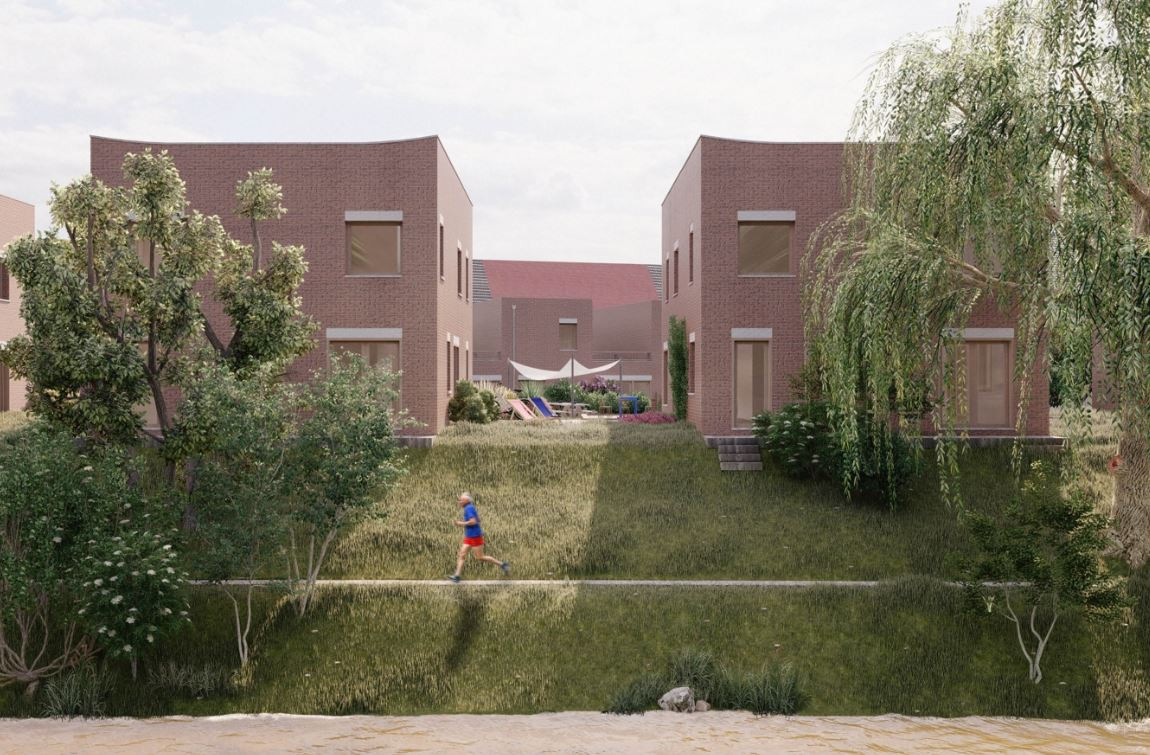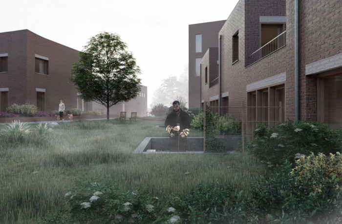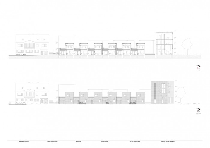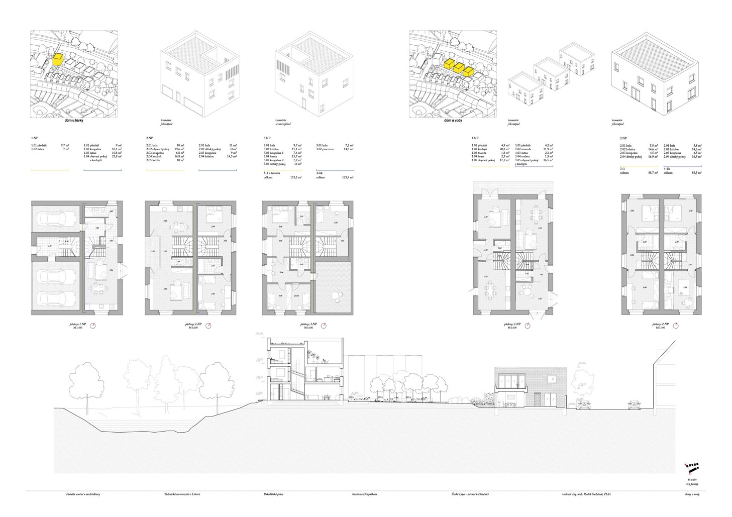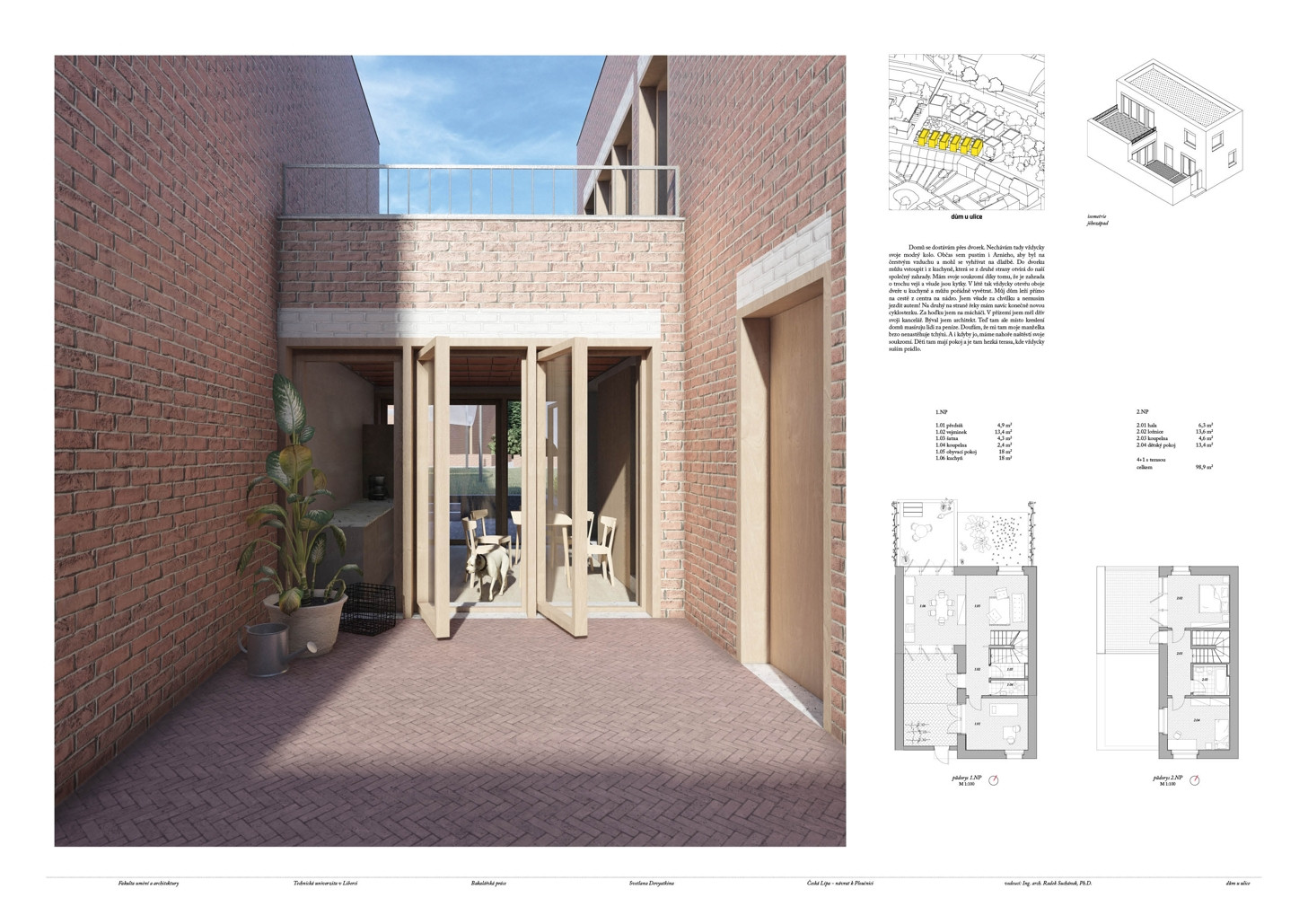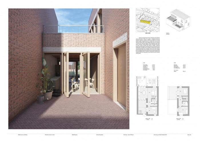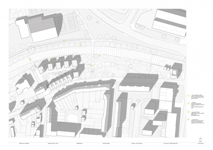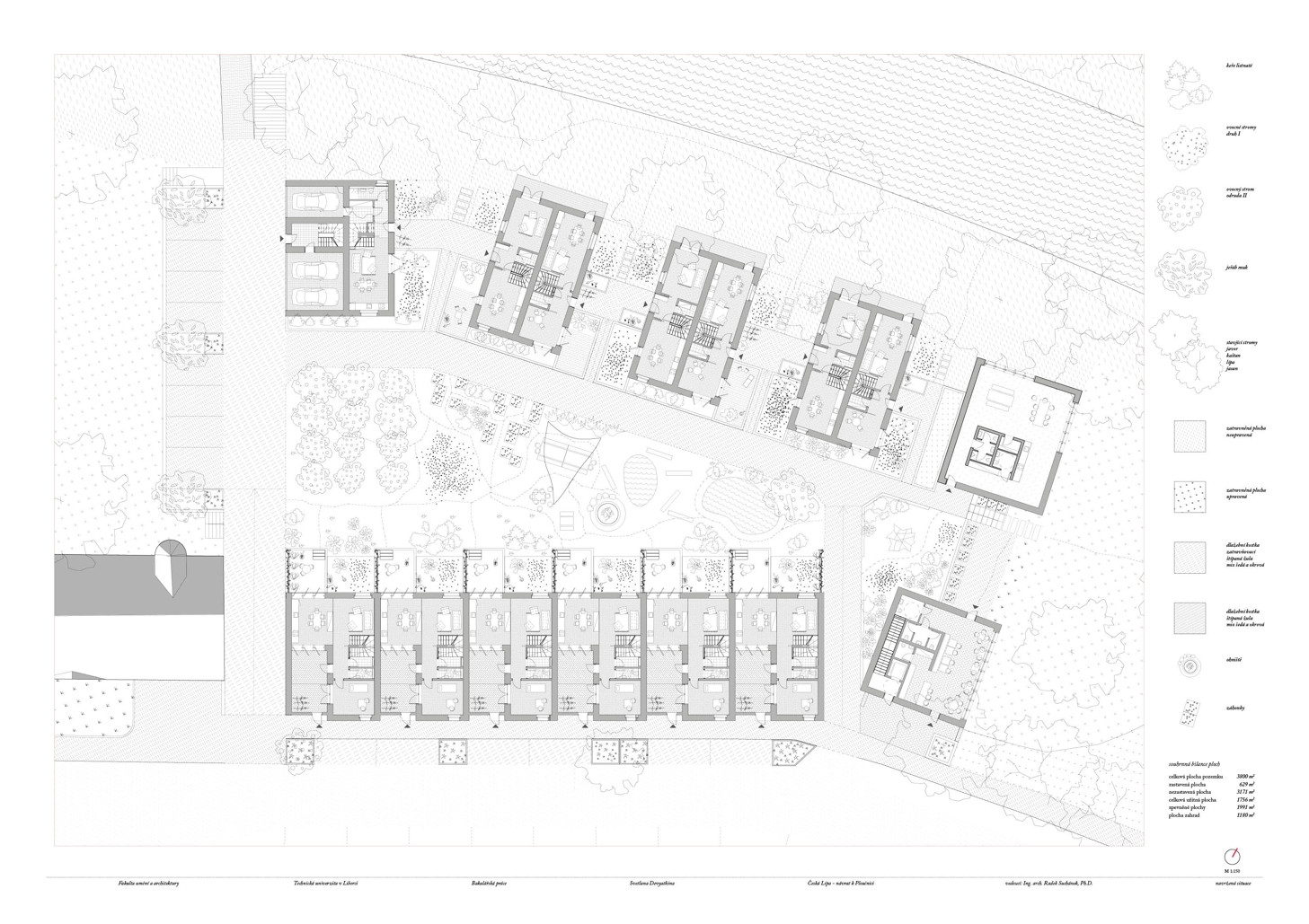 Na řešeném pozemku počítám se zachováním a rekonstrukcí vily, která by měla být využívána Farní charitou. Její přístavby z 70. let budou odstraněny a na místě vznikne nová zahrada a parkovací stání. Stávající strukturu doplňuji o řadové domy, definující uliční čáru, a tím posilují městský charakter. Z urbánního hlediska má zástavba směrem k řece charakter solitérních objektů. V tomto duchu navrhuji na břehu řeky dvojdomy obklopené zahradou. Tyto struktury se potkávají v pomyslném těžišti návrhu – dvoře, kde se odehrává společenský život komunity obyvatel. Tady se scházejí sousedi, slaví narozeniny a pěstuje ovoce nebo zelenina.