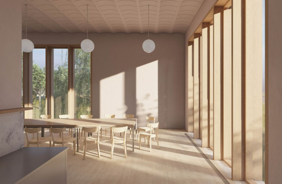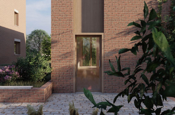Nová zástavba je ukončena dvěma domy s veřejnou funkcí, které tvoří propustnou membránu mezi parkem a zahradou. Pomyslně doplňují hmotovou a funkční linku veřejných staveb u vody: kostel – dům – vila – charita. Zároveň lépe definují území parku a vytváří nový bod k zastavení na cestě z centra na autobusové a vlakové nádraží. V přízemí objektu u ulice se nachází nízkoprahová kavárna, ve vyšších patrech kanceláře městského architekta. Nižší objekt bude sloužit především lidem žijícím v blízkém okolí. Nabízí prostor k pronájmu, který může být využit dle jejich potřeb jako dílna, místnost na oslavy, sál na menší přednášky nebo cvičení.