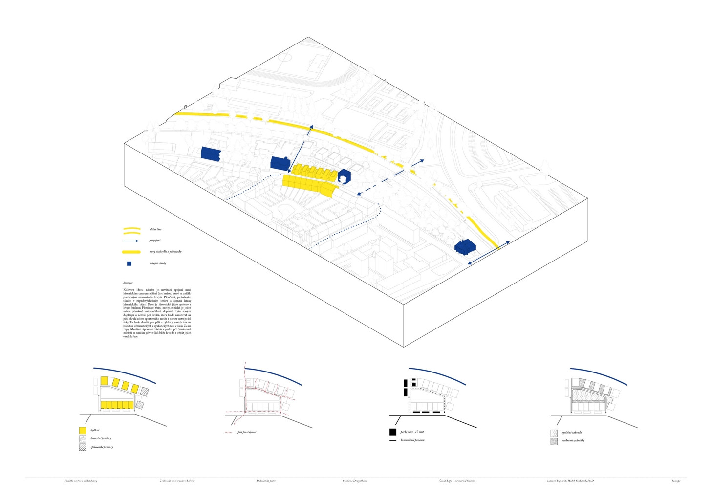 Řešené území na styku dvou urbanistických struktur skýtá velký potenciál pro město. Svojí prací chci upozornit na silné stránky místa, které je v současné době pozapomenuto, přestože leží v samém centru města. Jako alternativní možnost využití navrhuji soubor staveb s obytnou a komerční funkcí. Ideálním stavem je případný odkup pozemku městem a investice do dostupného bydlení.