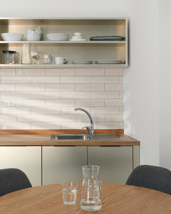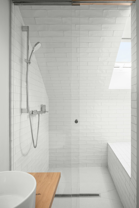 V celém domě se opakuje motiv trojúhelníku a šestiúhelníku, a to na kovových policích, osvětlení, dlažbě či obkladech. Jedním z požadavků investora bylo vybalancovat kvalitu a cenu. V rámci úspor proto přistoupil realizační tým například k využití odřezků z výroby keramických obkladových pásků pro podlahu a zídky společného dvorku.