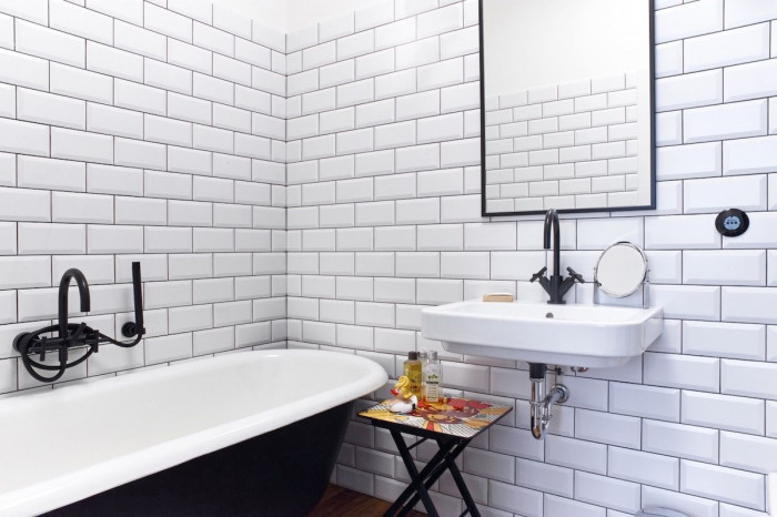 Každá z koupelen je zcela v jiném duchu. V první jsme použili zrenovovanou historickou vanu. V druhé koupelně je dominantou deska z tropického dřeva v kontrastu s betonovým povrchem stěn a nerezovým WC.